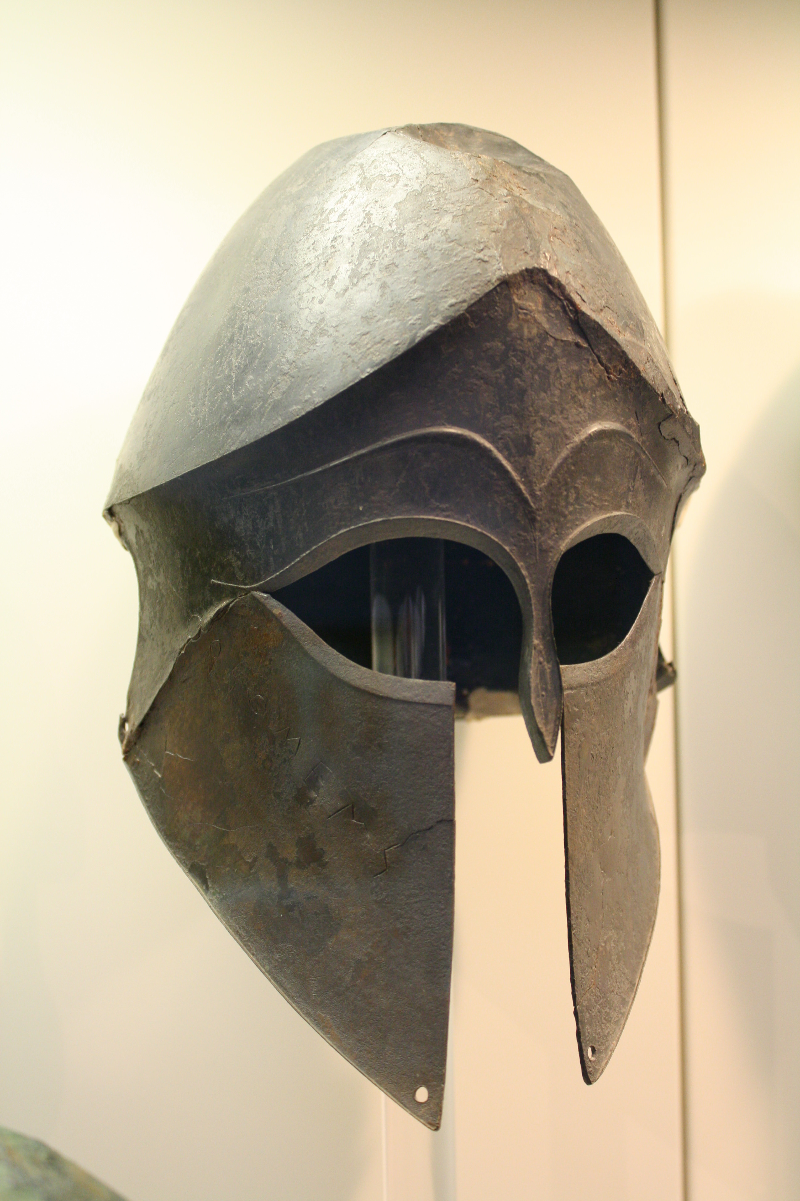 A bronze 'Corinthian' helmet (6-5th century BCE). Olympia Archaeological Museum.