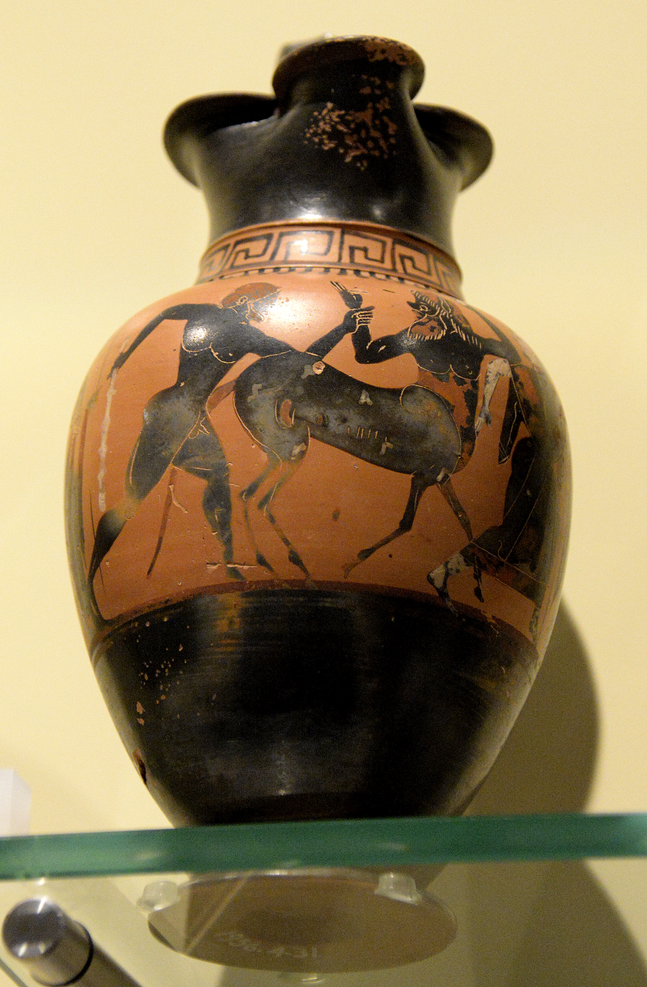The Oinochoe (or oenochoe) is one of the key forms of painted terracotta Greek pottery; it is a form of wine jug. Centaurs were half man and half horse. This combination of brute strength and strong instinct meant that they could be volatile and aggressive. Representing the bestial side of humanity, they served as a warning to the ancient Greek against the danger of allowing passion to overcome reason. Attica, Greece, 6th century BCE. (National Museum of Scotland, Edinburgh, UK)