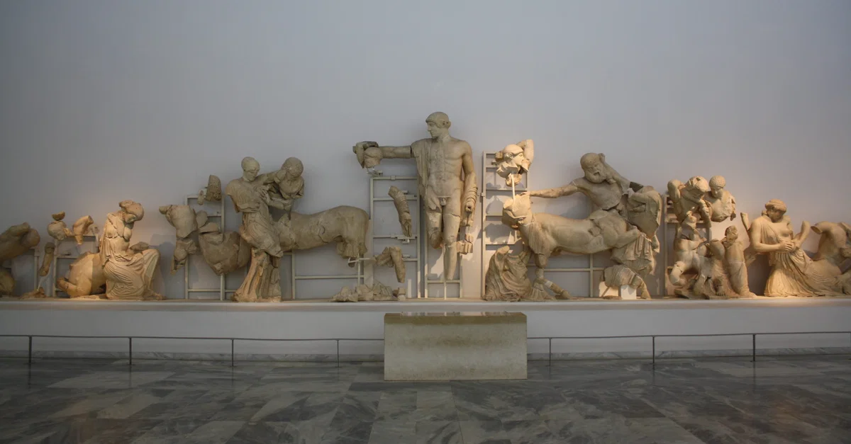 The west pediment of the temple of Zeus at Olympia representing the battle between the Lapiths and the Centaurs in Thessaly. Symbolic of the greek victory over barbarians or reason over savage nature. Severe style sculpture, c. 460 BCE. Olympia Archaeological Museum.