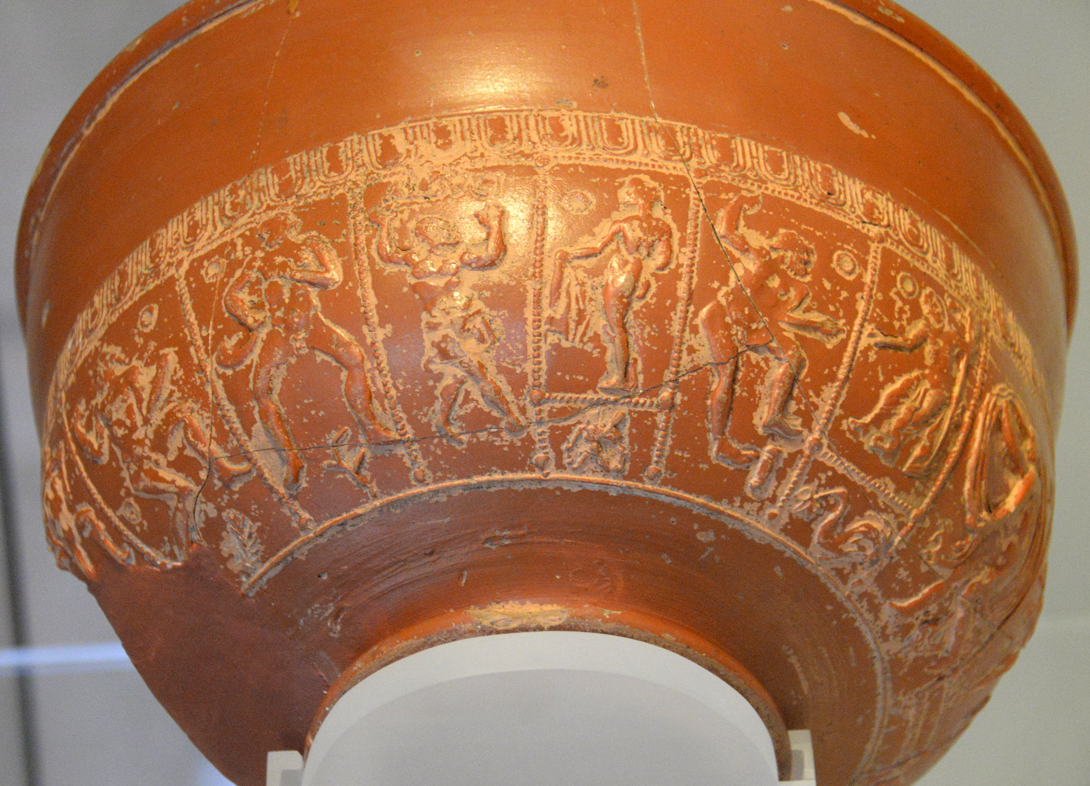 Neptune was god of the oceans, freshwater, and seas (he was the counterpart of the Greek god Posiedon). The outer surface of this bowl was decorated with Neptune and a merman on his left and dolphin and Jupiter to his right. From Inveresk, Scotland, late 1st century to late 2nd century CE. (National Museum of Scotland, Edinburgh, UK)
