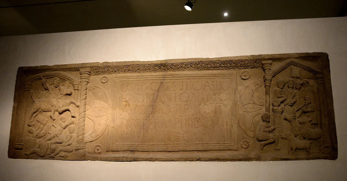 This carved slab (also known as the Bridgeness slab) commemorates building the most eastern part of the Antonine wall, which cut Scotland into two. Its grand inscription records the army's dedication of the building work to their emperor. The theme of the slab is conquest and domination. The left hand panel depicts the noble Roman soldiers defeating the native tribes, who are shown as naked and cowering barbarians. The right hand panel shows a religious ceremony in which sacrifices are being offered to bring luck to the army. This was a religion very far from native ways. The inscriptions on the slab read "For the Emperor Caesar Titus Aelius Hadrianus Antoninus Augustus Pius, Father of his Country, the 2nd Augustan Legion completed [the Wall] over a distance of 4655 paces." From Bridgeness, Scotland, 2nd century CE. (National Museum of Scotland, Edinburgh, UK)