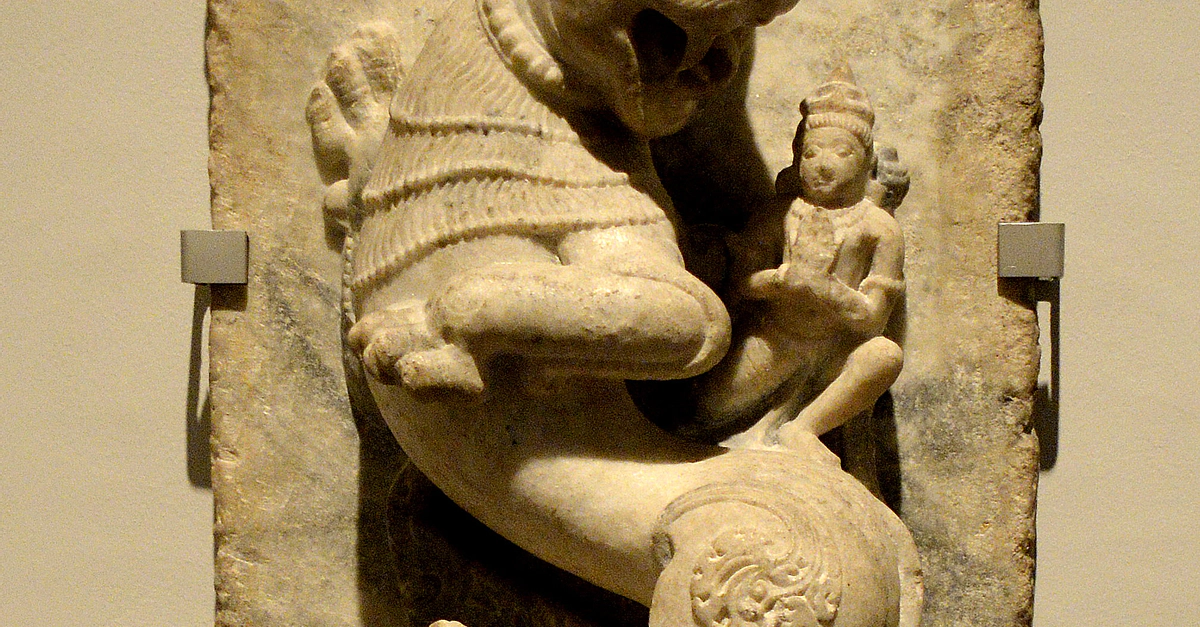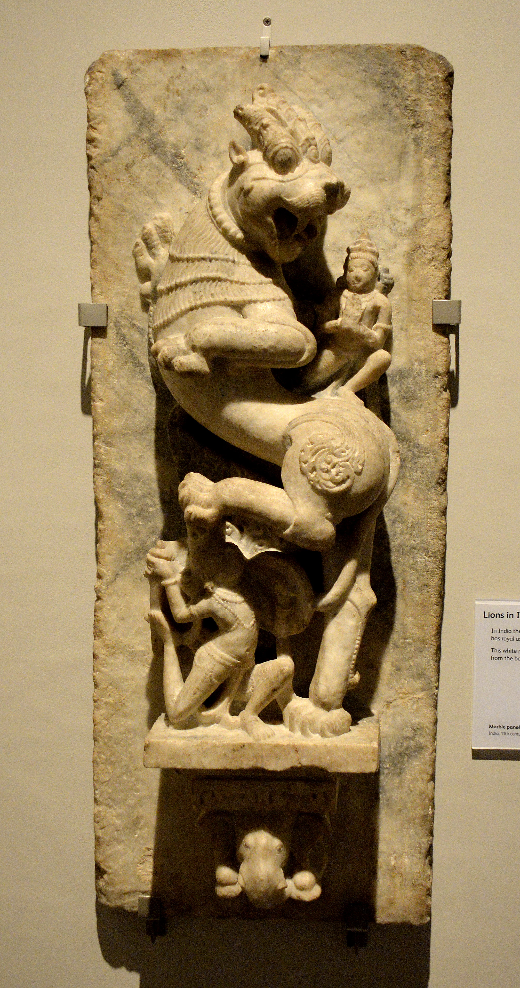In India, the lion is known as the Lord of Beasts and has royal associations. This marble white panel is an architectural figure from the base of an Indian temple. From India, 11th century CE. (National Museum of Scotland, Edinburgh, UK)