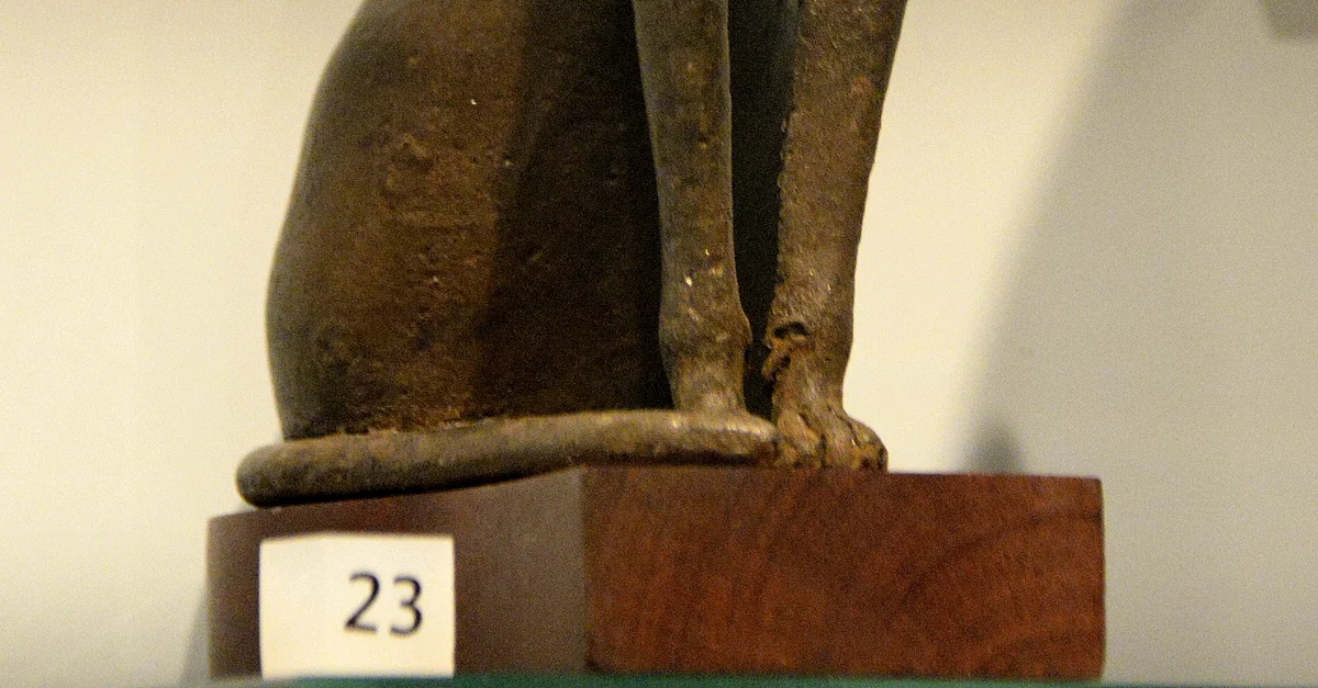 Hollow-cast bronze cat, probably a votive offering to the goddess Bastet, from Tell Basta, Egypt, c. 664-30 BCE.