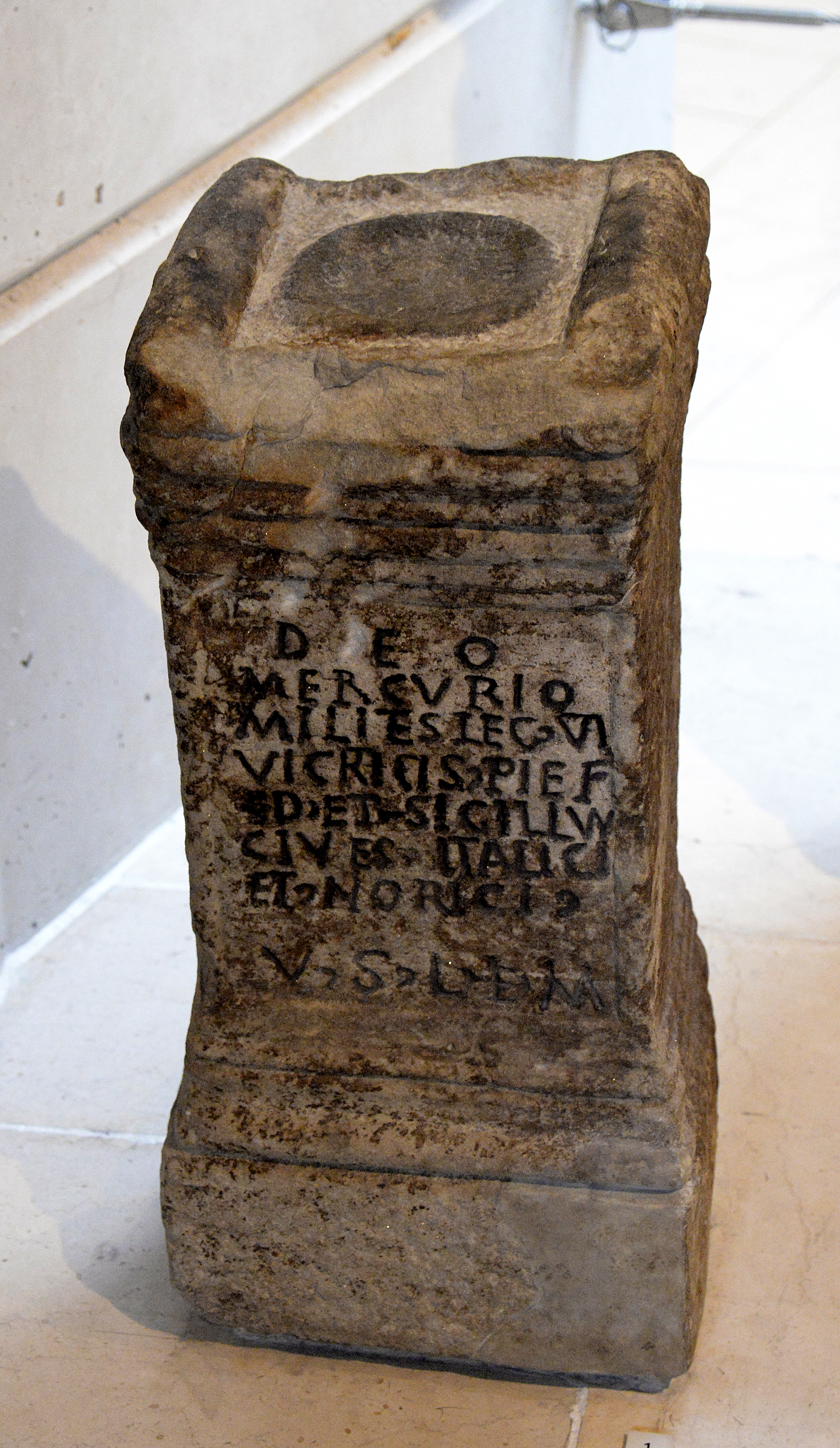 The God Mercury was one of the Dii Consentes (12 major deities in the Pantheon of ancient Rome; 6 gods and 6 goddesses). Mercury was the god of financial gain, commerce, messages, and travelers. Some altars are official offerings by military units. The inscriptions on this altar read "To the god Mercury; soldiers of the 6th Legion, Victorious, Dutiful, and Loyal; set up this shrine and statuette; citizens of Italy and Noricum; gladly, willingly, and deservedly fulfilled their vow." From Castlecary, Scotland, 2nd century CE. (National Museum of Scotland, Edinburgh, UK)
