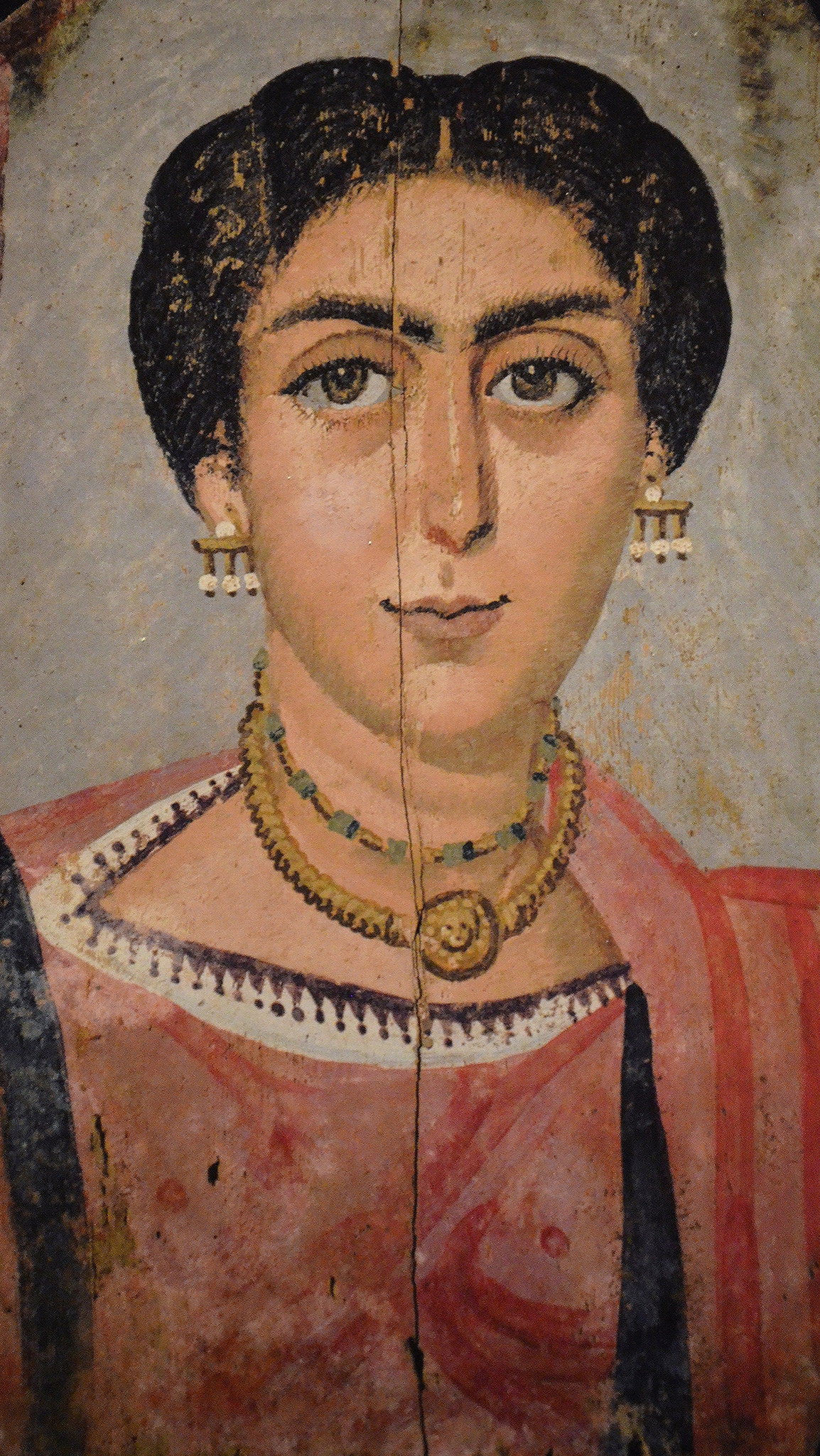 Mummy portrait of a woman wearing a gold necklace, a Medusa pendant, and golden ear-pendants with pearls, Roman Egypt, 161-192 CE.
