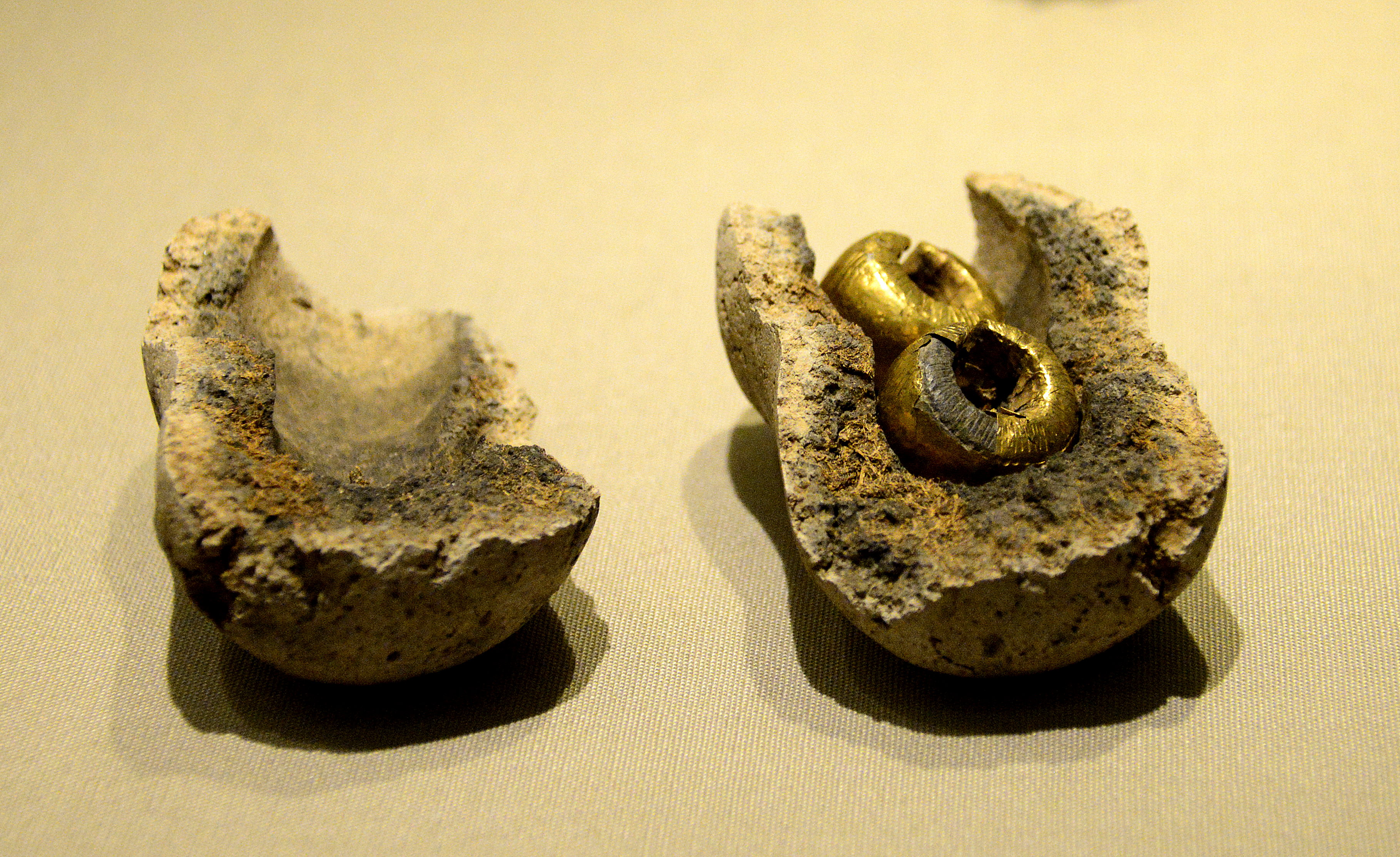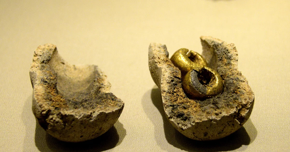 Two small gold foil-covered lead bullae (amulet or pendant), found inside a ceramic vessel, from Annaghbeg or Monasterredan, Co. Sligo, Ireland, c. 800-700 BCE.