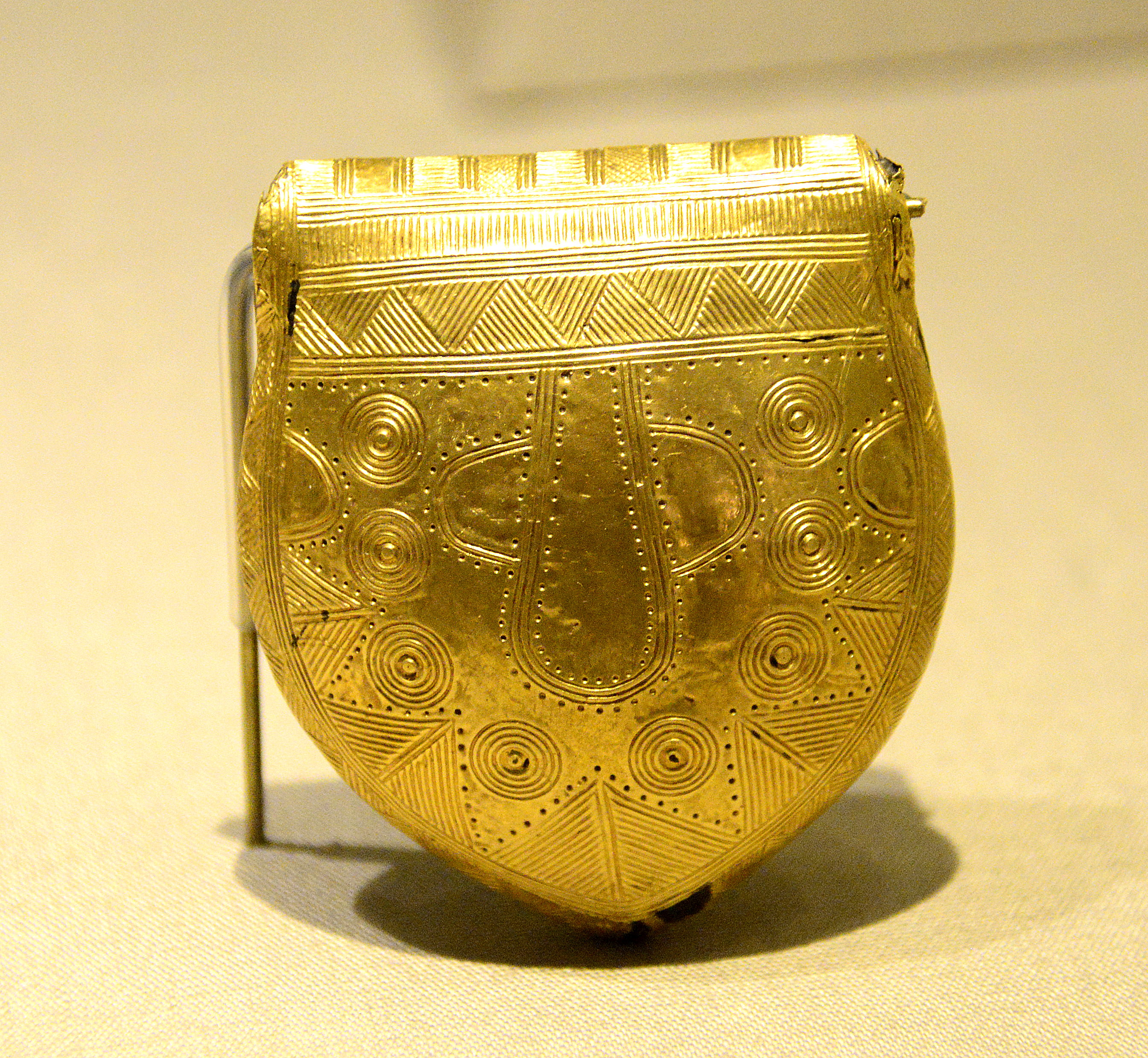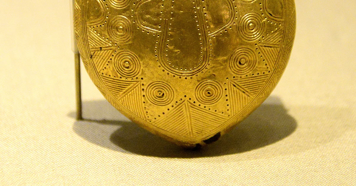 This Gold foil-covered lead bulla or amulet was found in Bog of Allen, Ireland. Circa 800-700 BCE. (National Museum of Ireland-Archaeology, Dublin, Republic of Ireland)
