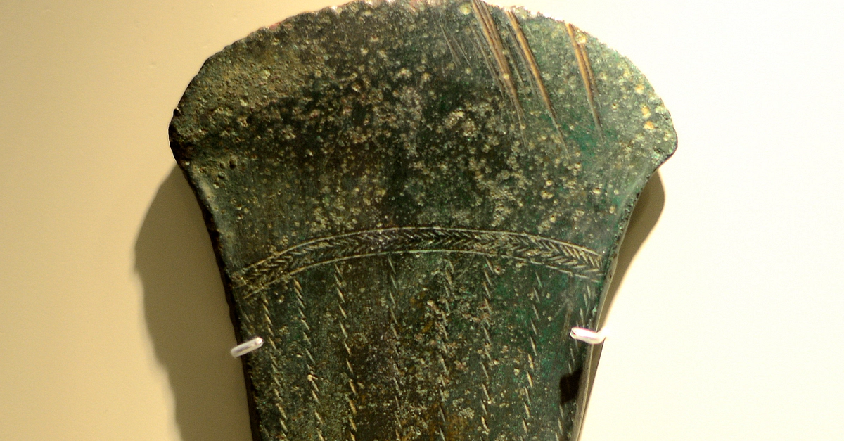 The locality of excavation of this decorated flat axehead is unknown. Circa 1600 BCE. (National Museum of Ireland-Archaeology, Dublin, Republic of Ireland)