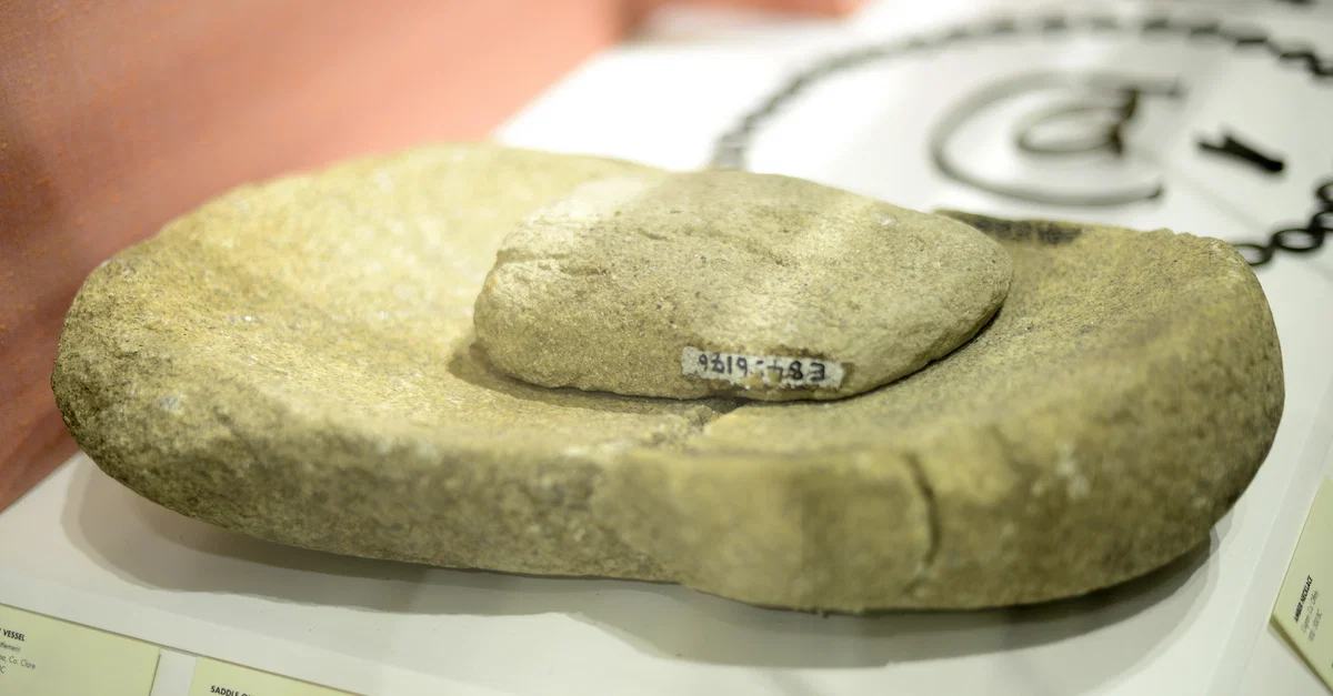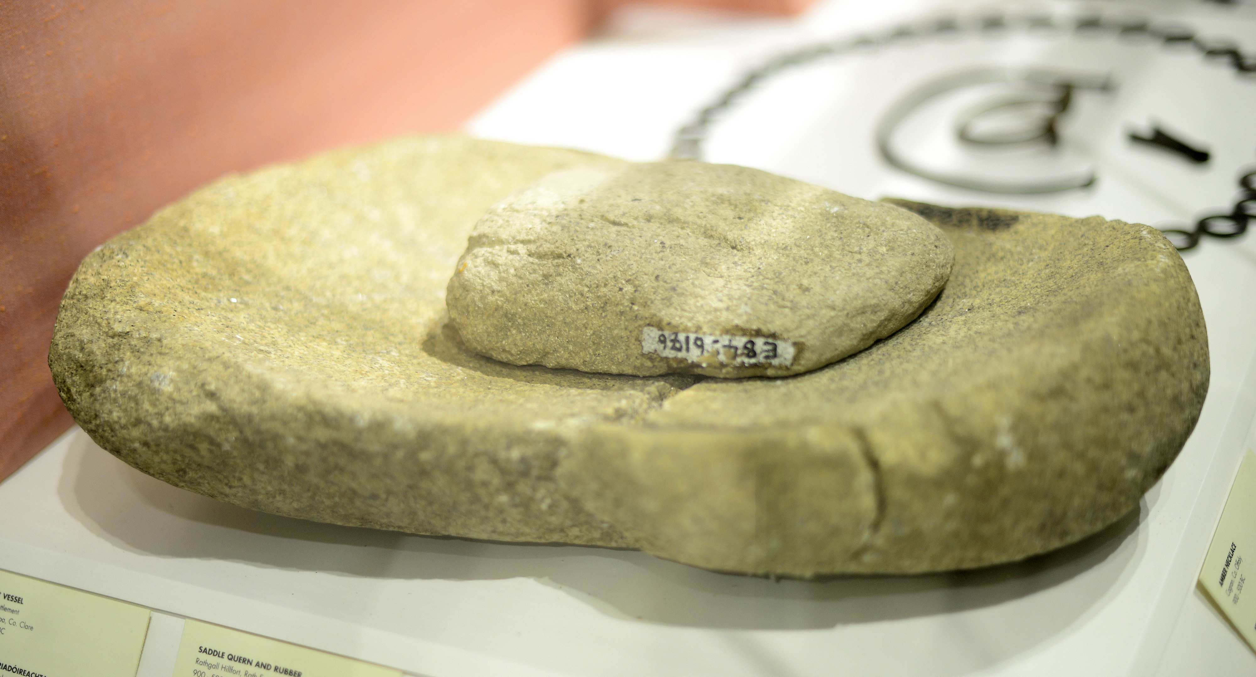Saddle-shaped quern (grindstone) and its rubber, found at Rathgall Hillfort, Rath East, Co. Wicklow, Ireland, 900-500 BCE.