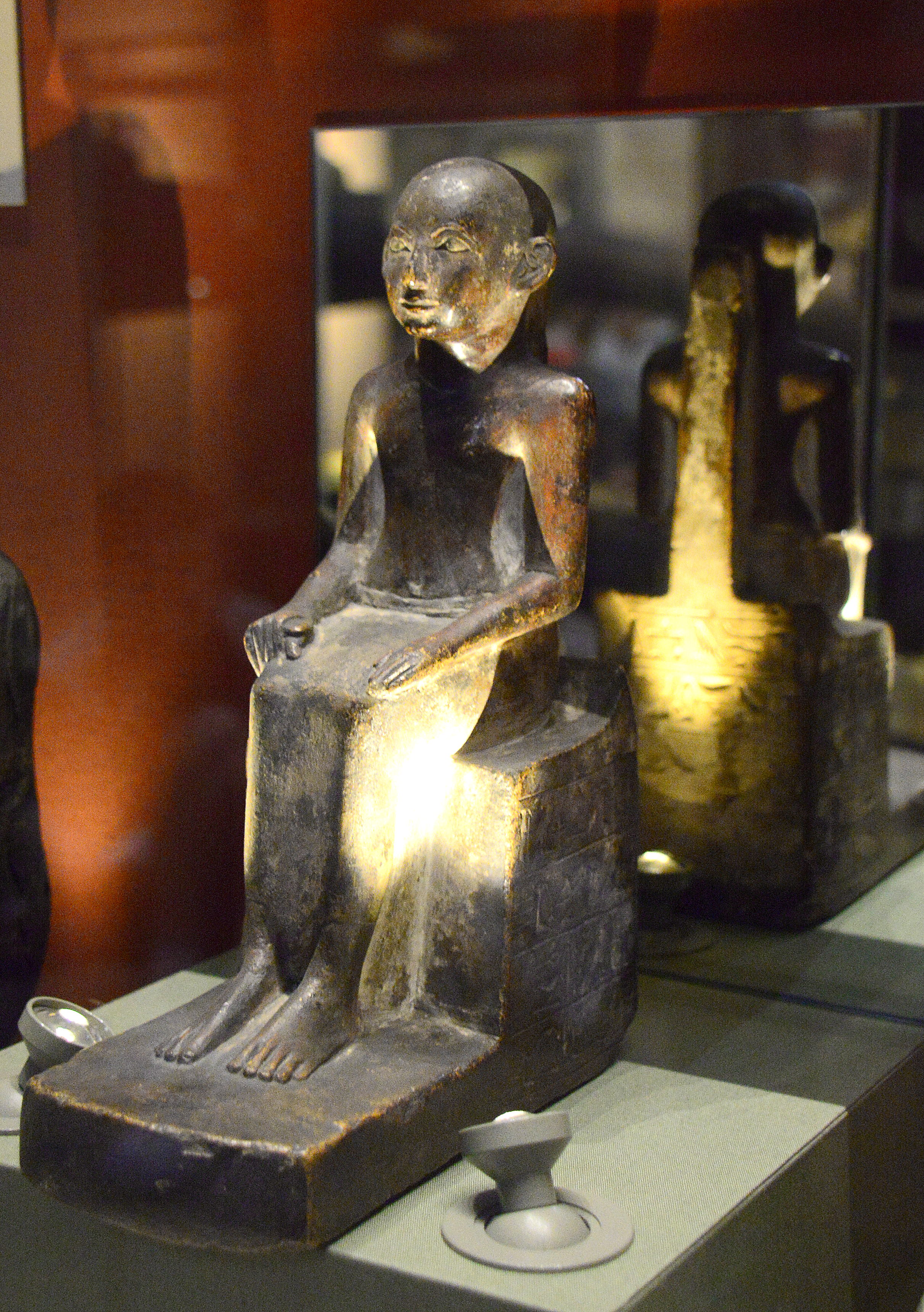 The inscriptions on the sides identify the man as Senemiah, a priest of the Theban moon-god Khons, with the unsual phrase "he whose hands are pure when adorning his god," referring to the daily ritual in which the image of the god was given fresh food and clothing. This is a fine example of a type of small statue placed in tombs at this period, inscribed in clearly incised hieroglyphs with the formula requesting a share in the offering made by the king to the gods. Probably from Thebes, Egypt. Early 18th Dynasty, circa 1500 BCE. (National Museum of Ireland-Archaeology, Dublin, Republic of Ireland)