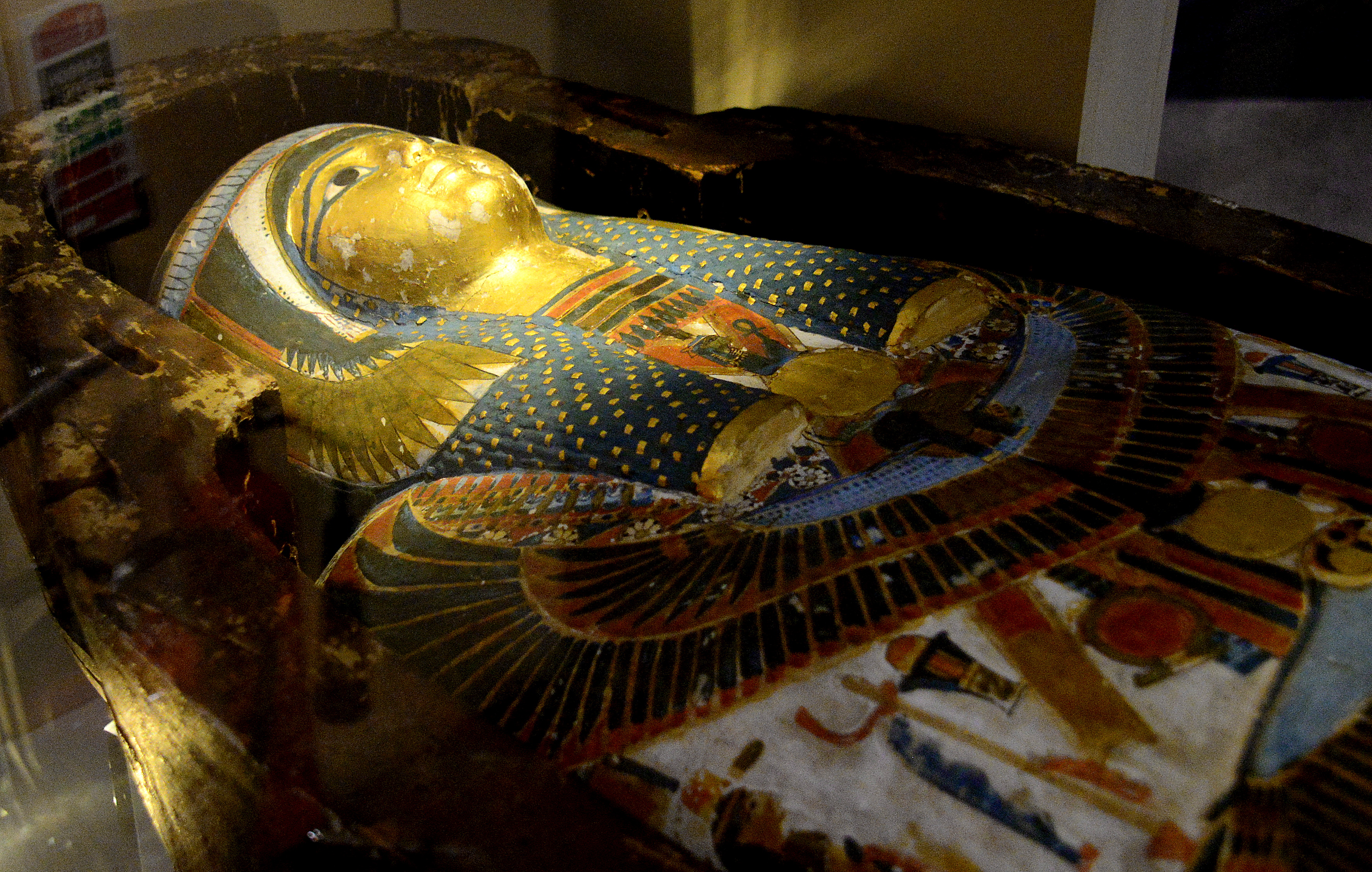 The mummy, wrapped in linen bandages, is enclosed in a body-shaped envelope of cartonnage (a light-weight material composed of layers of gummed linen and plaster), which could be moulded to the desired shape. The surface is decorated with texts and religious images in brilliant colors. On the upper body, a ram-headed falcon representing the sun-god embraces the deceased. Between this and the second falcon, are the figures of the 4 sons of Horus, minor deities who protected the internal organs of the body. A central inscription addressed to the sun god requests funerary offerings on behalf of the dead woman. The wooden coffin is also painted and inscribed but the details are obscured by a coat of thick varnish. X-rays of the mummy have shown that Tentdinebu died at an advanced age. Artificial eyes were inserted into the sockets and the thorax, abdomen, and pelvis were filled with dense packing material; all features typical of the Egyptian embalming techniques in the 22nd and 21st Dynasties. Probably from Thebes, Egypt. 22nd Dynasty, 945-716 BCE. (National Museum of Ireland-Archaeology, Dublin, Republic of Ireland)