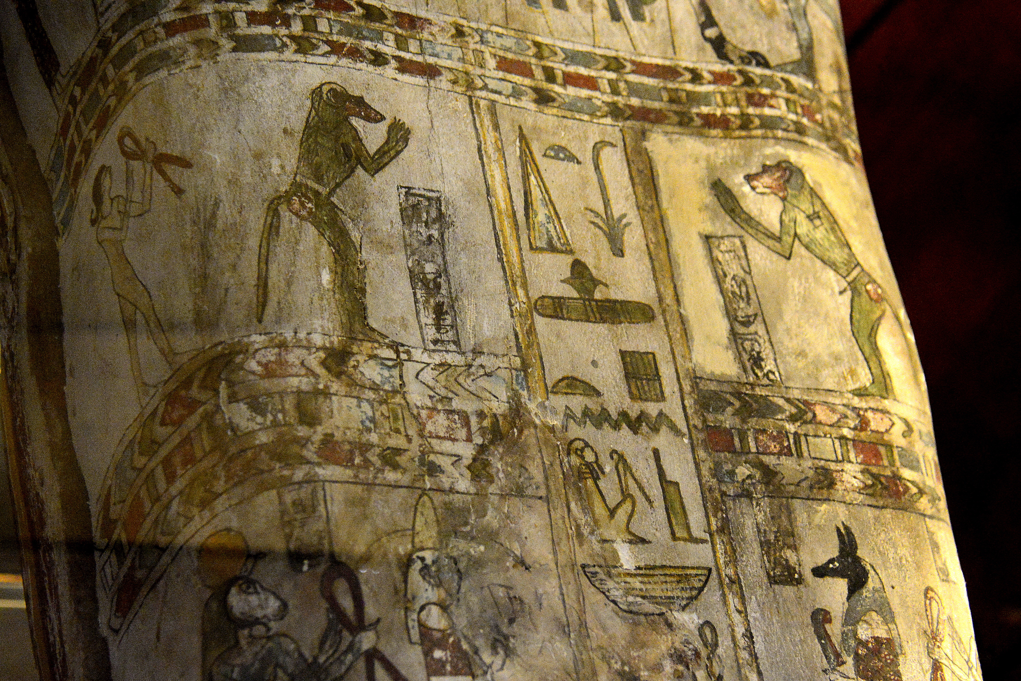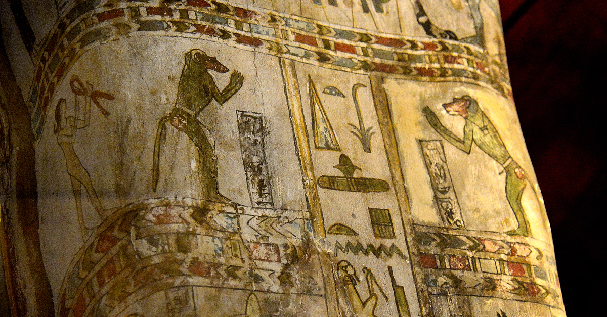 The surfaces of the coffin of Diefiawet were covered with painted scenes and hieroglyphic texts to assist and protect her passage into the afterlife. Isis and Nephthys, the sisters of Osiris, protect the head and the foot of the mummy, and goddess Nut spreads her winged arms over the breasts. A series of gods arranged along the sides of the case provide additional divine protection. The inscription in the center of the lid begins with the parentage of Diefiawet, who was the daughter of a temple doorkeeper. They continue with the full text of Chapter 89 of the Book of the Dead, a magical spell to ensure that the Ba (spirit) should be united with the body after death. From Egypt; precise provenance of excavation is unknown. The coffin dates back to the 26th Dynasty, 664-525 BCE, while the mummy dates back to the Ptolemaic period, 305-30 BCE. (National Museum of Ireland-Archaeology, Dublin, Republic of Ireland)