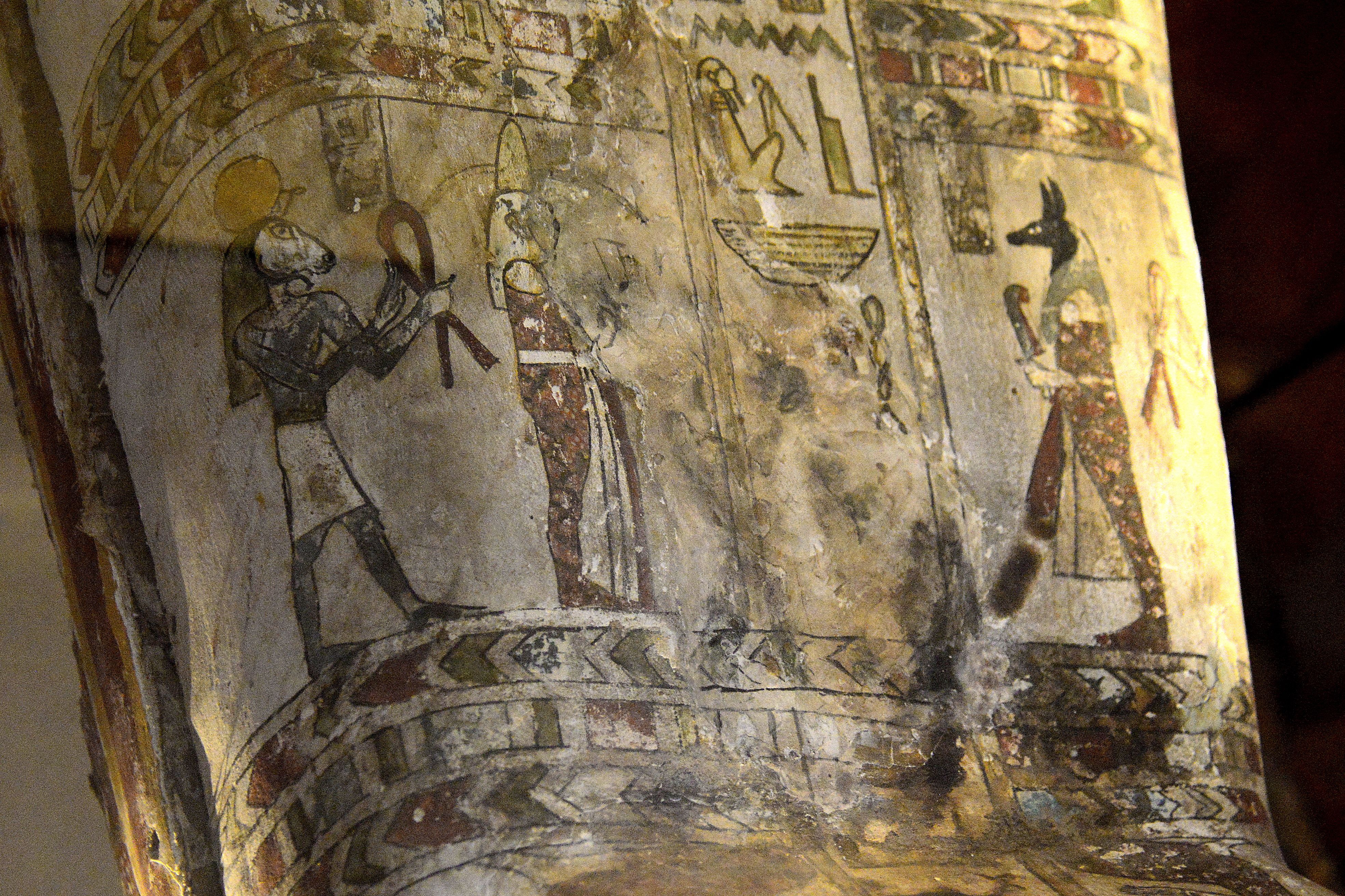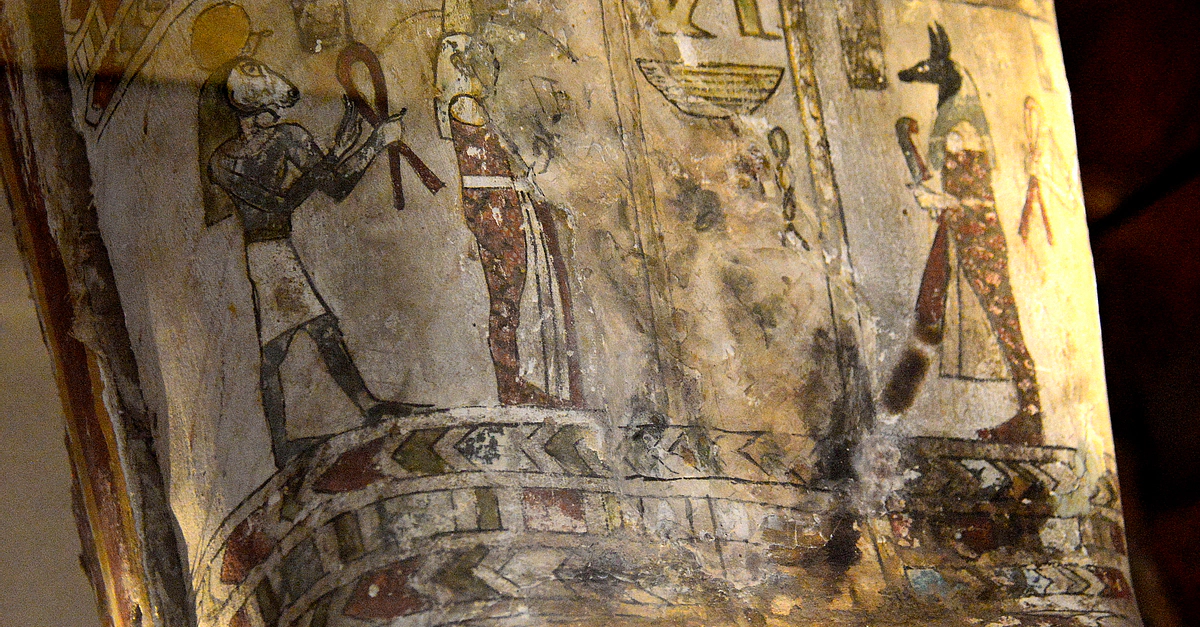 The surfaces of the coffin of Diefiawet were covered with painted scenes and hieroglyphic texts to assist and protect her passage into the afterlife. Isis and Nephthys, the sisters of Osiris, protect the head and the foot of the mummy, and goddess Nut spreads her winged arms over the breasts. A series of gods arranged along the sides of the case provide additional divine protection. The inscription in the center of the lid begins with the parentage of Diefiawet, who was the daughter of a temple doorkeeper. They continue with the full text of Chapter 89 of the Book of the Dead, a magical spell to ensure that the Ba (spirit) should be united with the body after death. From Egypt; precise provenance of excavation is unknown. The coffin dates back to the 26th Dynasty, 664-525 BCE, while the mummy dates back to the Ptolemaic period, 305-30 BCE. (National Museum of Ireland-Archaeology, Dublin, Republic of Ireland)