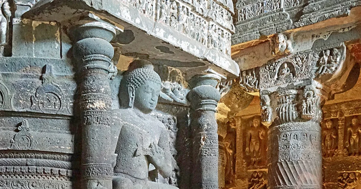 Ajanta (2nd century BCE – 6th century CE) sculpture showing highly evolved skills of the early Indian artists. A stupa belonging to Cave 26 is shown with sculpted figure of Buddha.