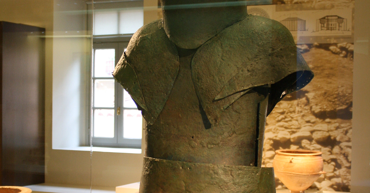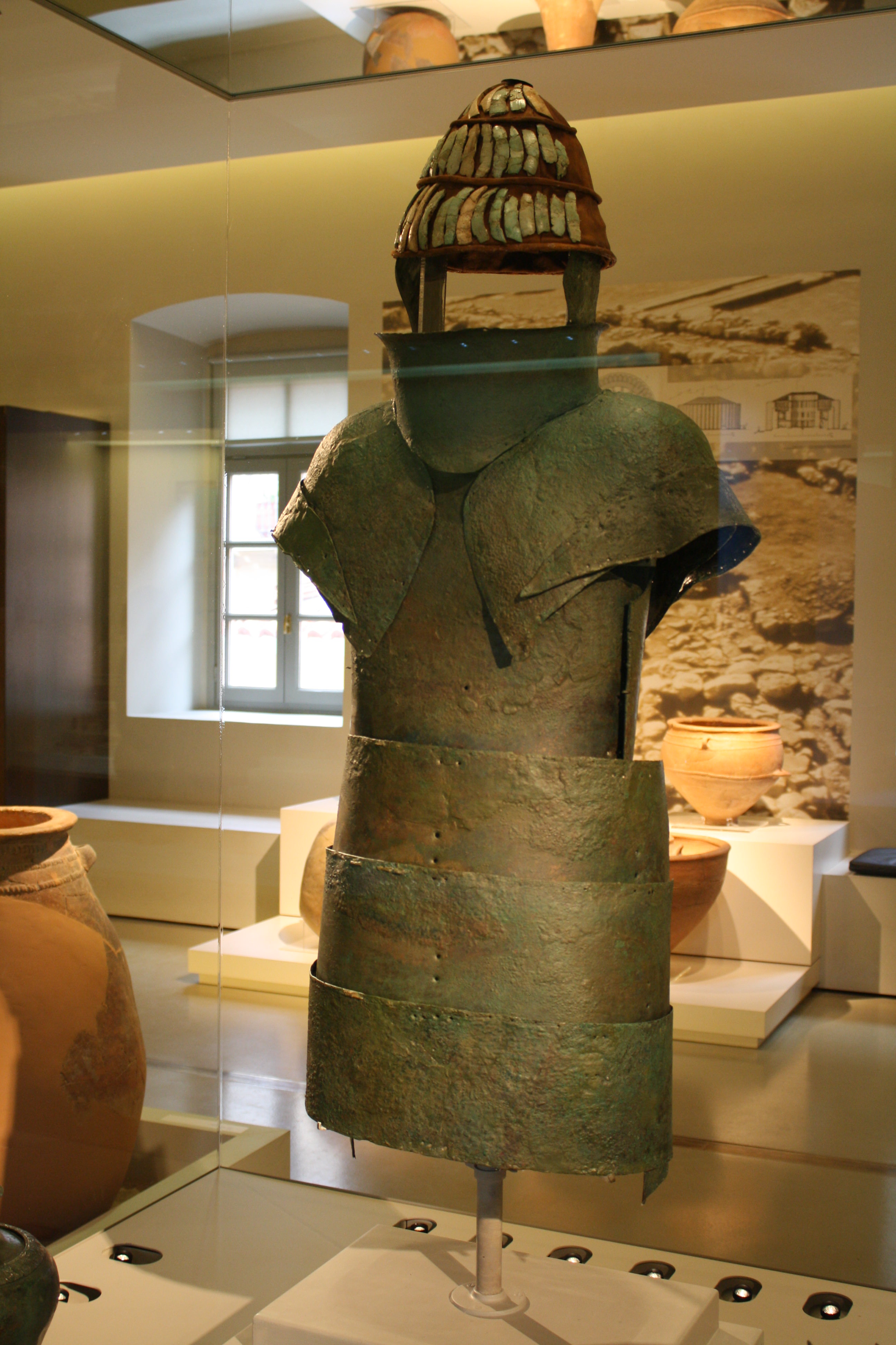 Bronze armour and boar tusk helmet (15th century BCE) from a mycenaean cemetery in Dendra. Nafplio Archaeological Museum.
