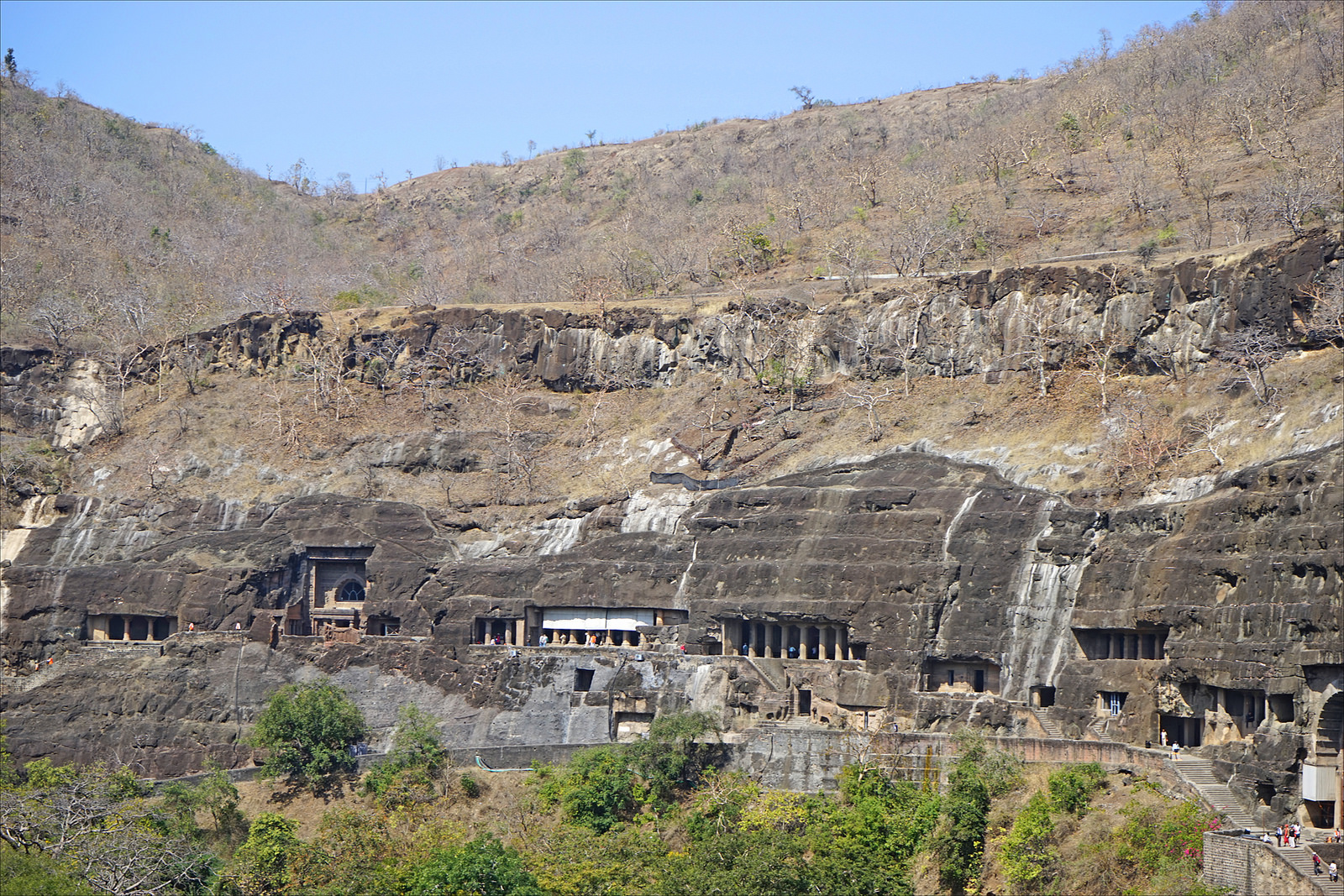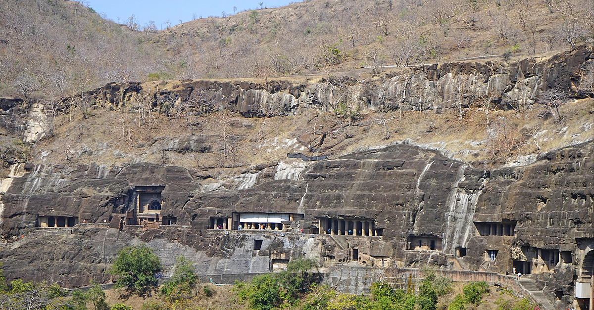 A panoramic view of the Ajanta Caves, India. The rock-cut Buddhist cave shrines date from the 2nd century BCE to the 6th century CE.