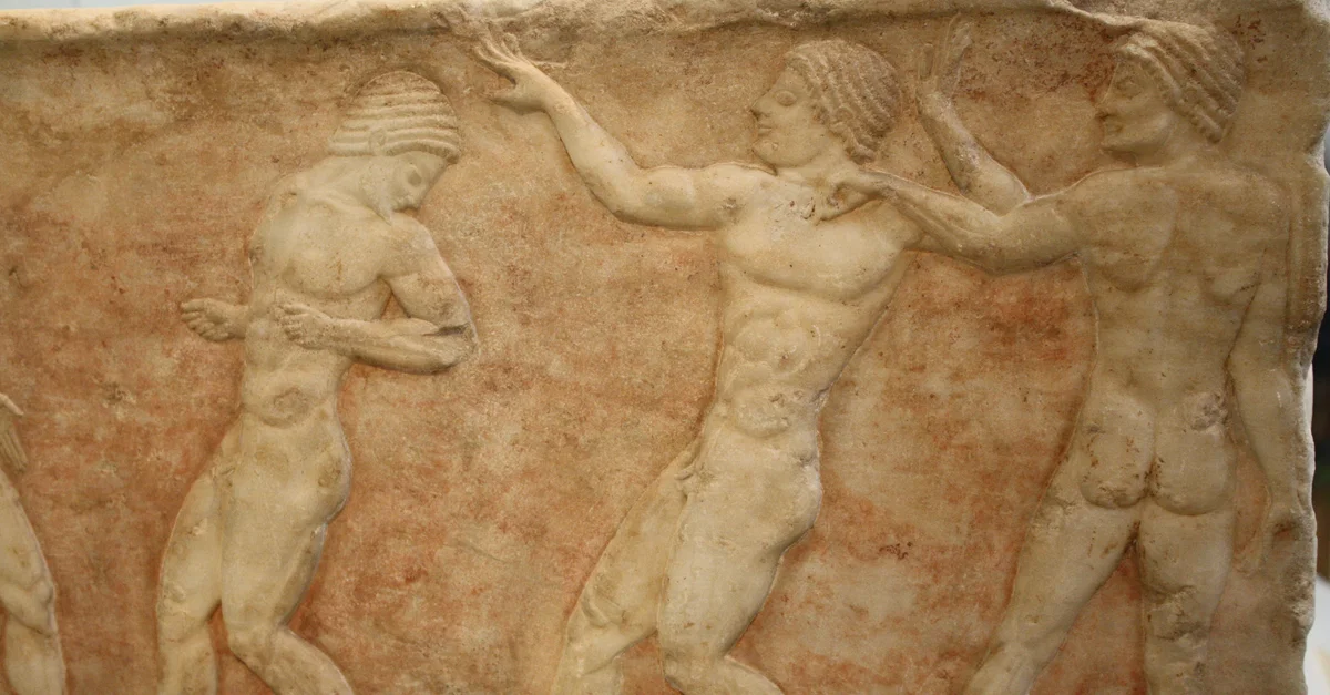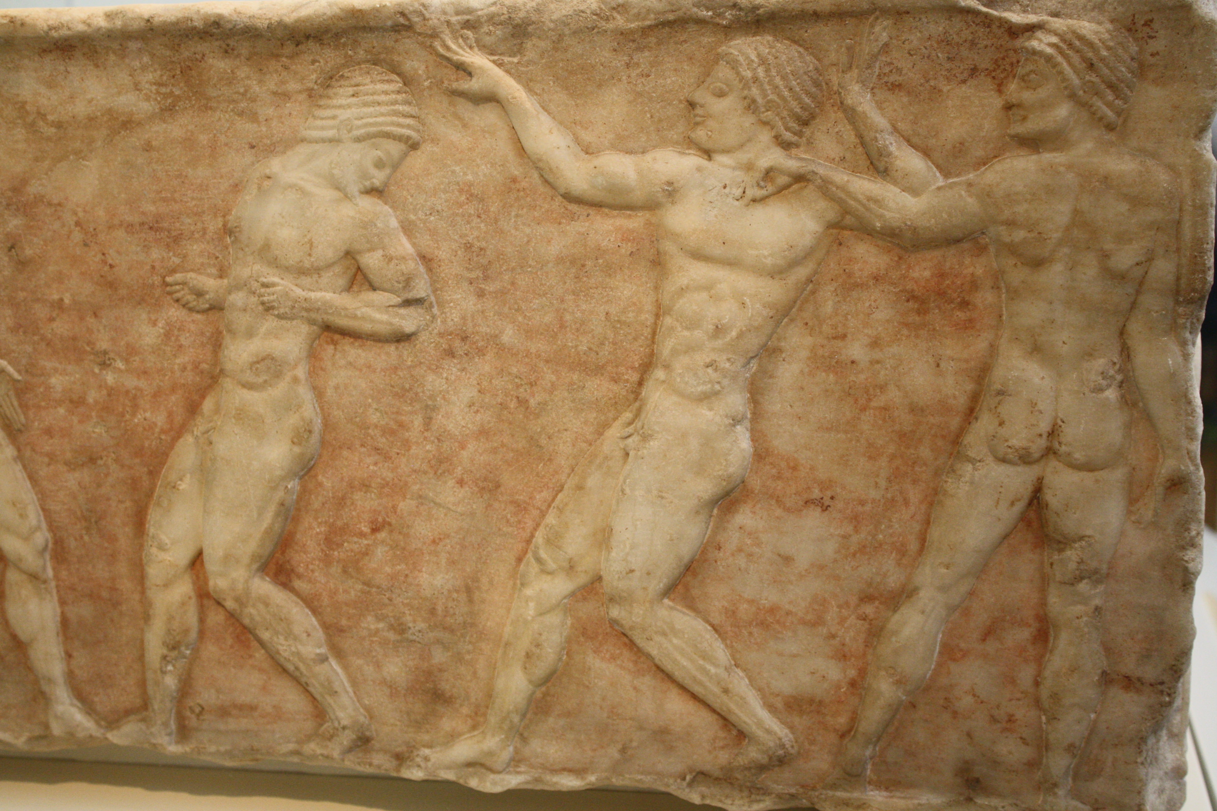 Greek athletes. From the base of a funerary kouros, later included in the Themistokleian Wall of Athens. 510-500 BCE. (National Archaeological Museum, Athens)