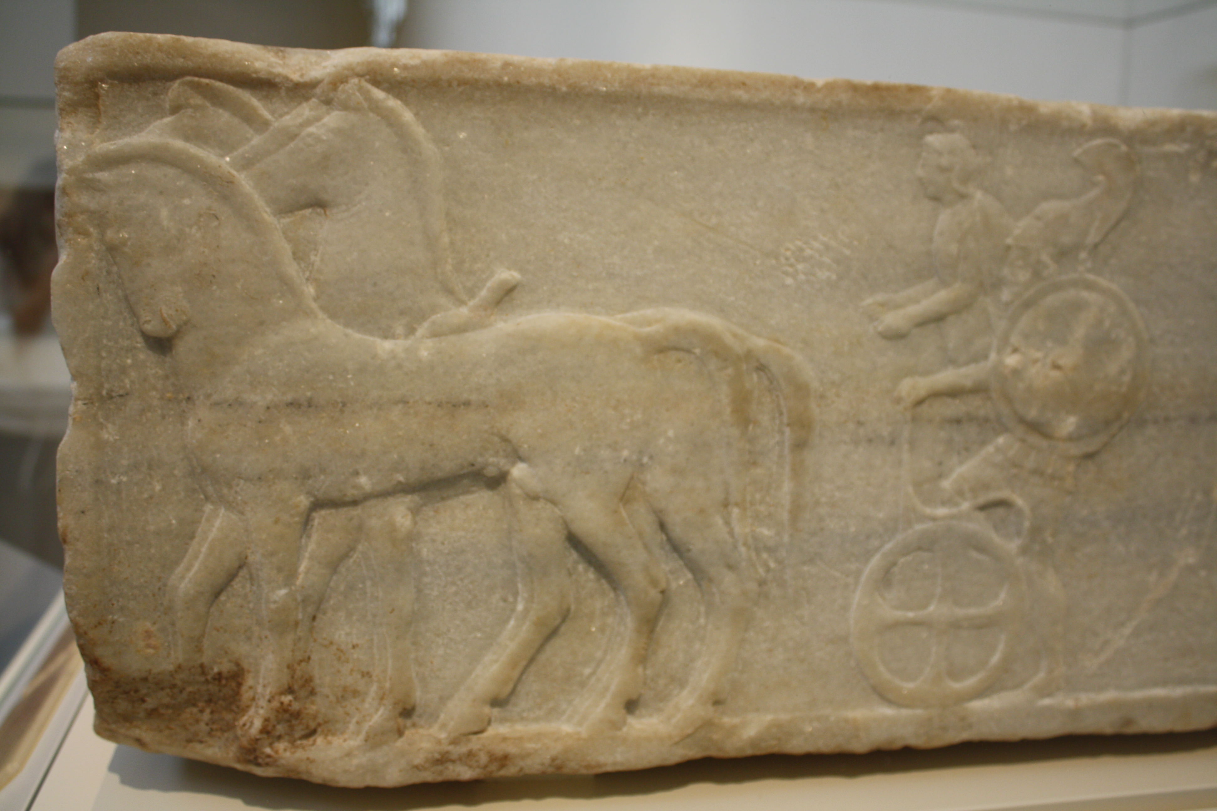 Greek chariot racers from the base of a funerary kouros, later included in the Themistokleian Wall of Athens. 510-500 BCE. (National Archaeological Museum, Athens)