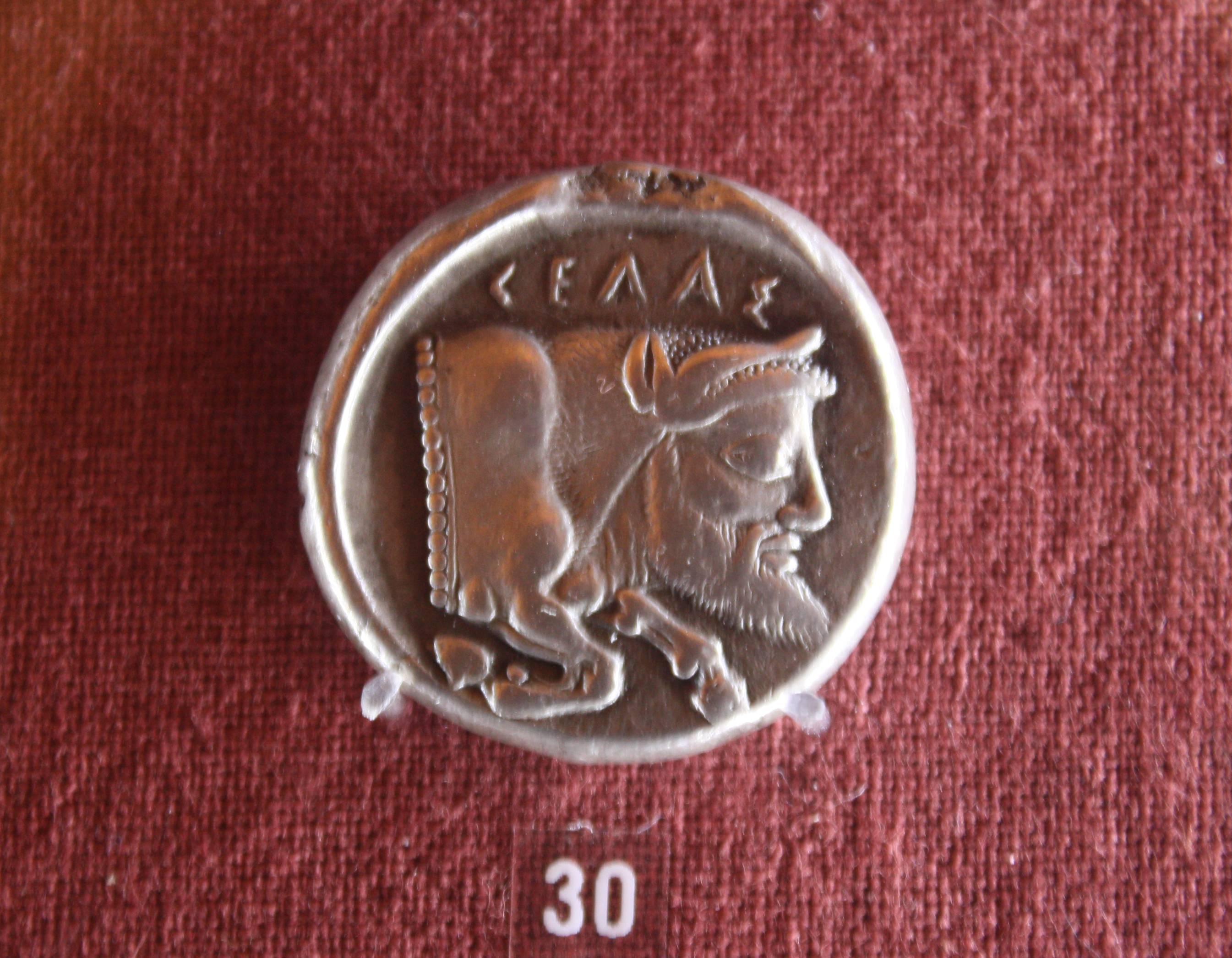 A silver coin depicting a man-headed bull from Gela, Sicily. 5th century BCE (Numismatics Museum, Athens)