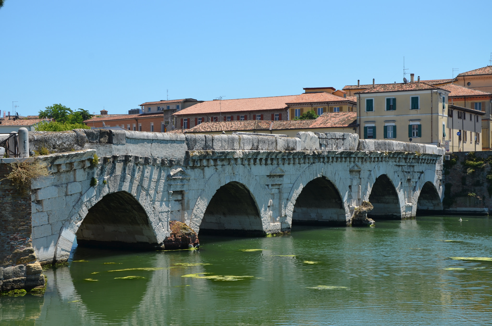Tiberius Bridge (Ponte di Tiberio) over the Ariminus river on the Via Aemilia in Rimini (called Ariminum in Roman times). It was constructed under Augustus and completed by Tiberius in 20 CE as the inscription sculpted on the inner part of the two parapets states.