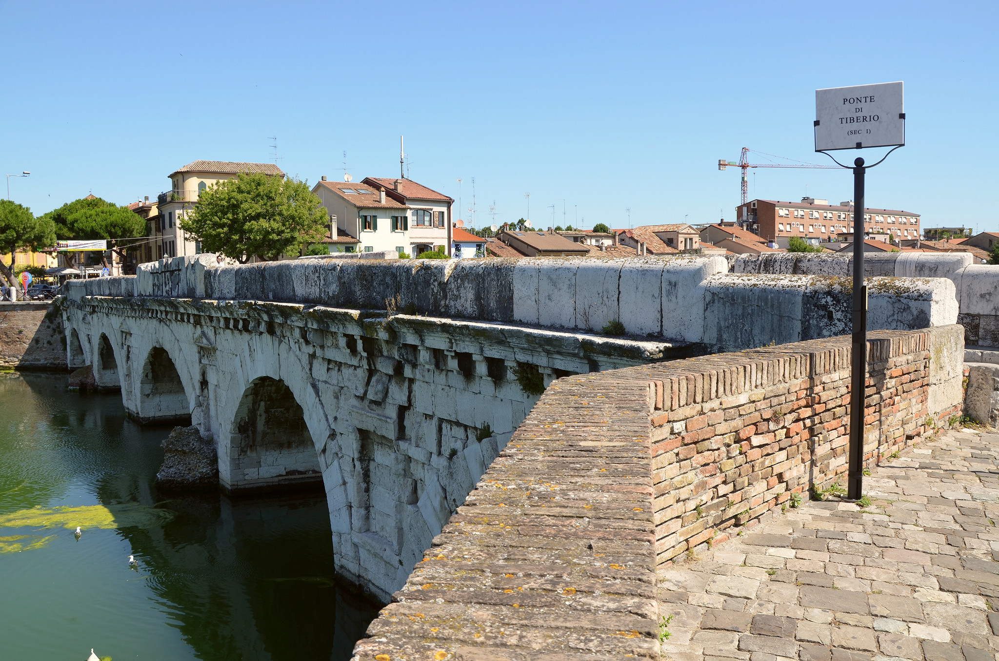 Tiberius Bridge (Ponte di Tiberio) over the Ariminus river on the Via Aemilia in Rimini (called Ariminum in Roman times). It was constructed under Augustus and completed by Tiberius in 20 CE as the inscription sculpted on the inner part of the two parapets states.