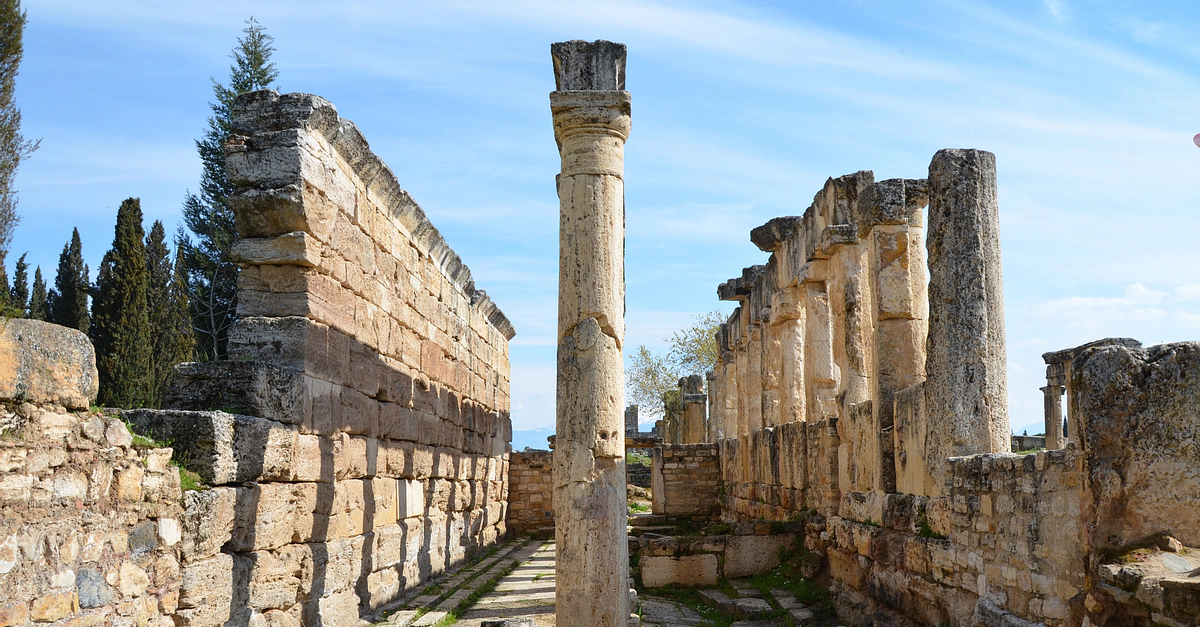 The latrine along Frontinus Street (colonnaded street) at Hierapolis in Phrygia (modern-day Turkey), built in the end of the 1st century CE. The room is divided longitudinally by a row of columns that supported a roof composed of travertine blocks.