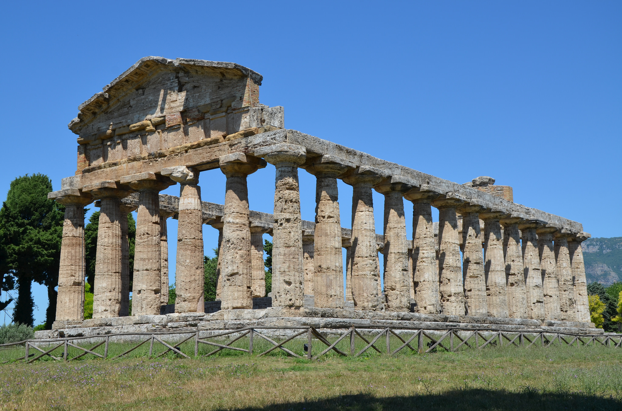 The Temple of Athena at Poseidonia/Paestum (Italy). The temple dates to the late 6th century BCE and consists of an external colonnade of 6 x 13 columns. It has elements of both Ionic and Doric architecture. The columns of the exterior colonnade are Doric, while the columns of the pronaos are Ionic.