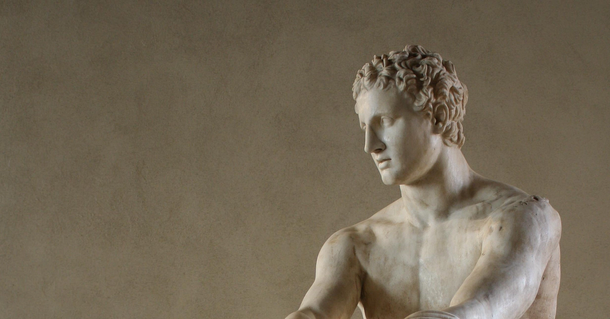A marble statue of a seated Ares, Greek god of war. Eros plays at the god's feet. 2nd century BCE. (Palazzo Altemps, Rome)