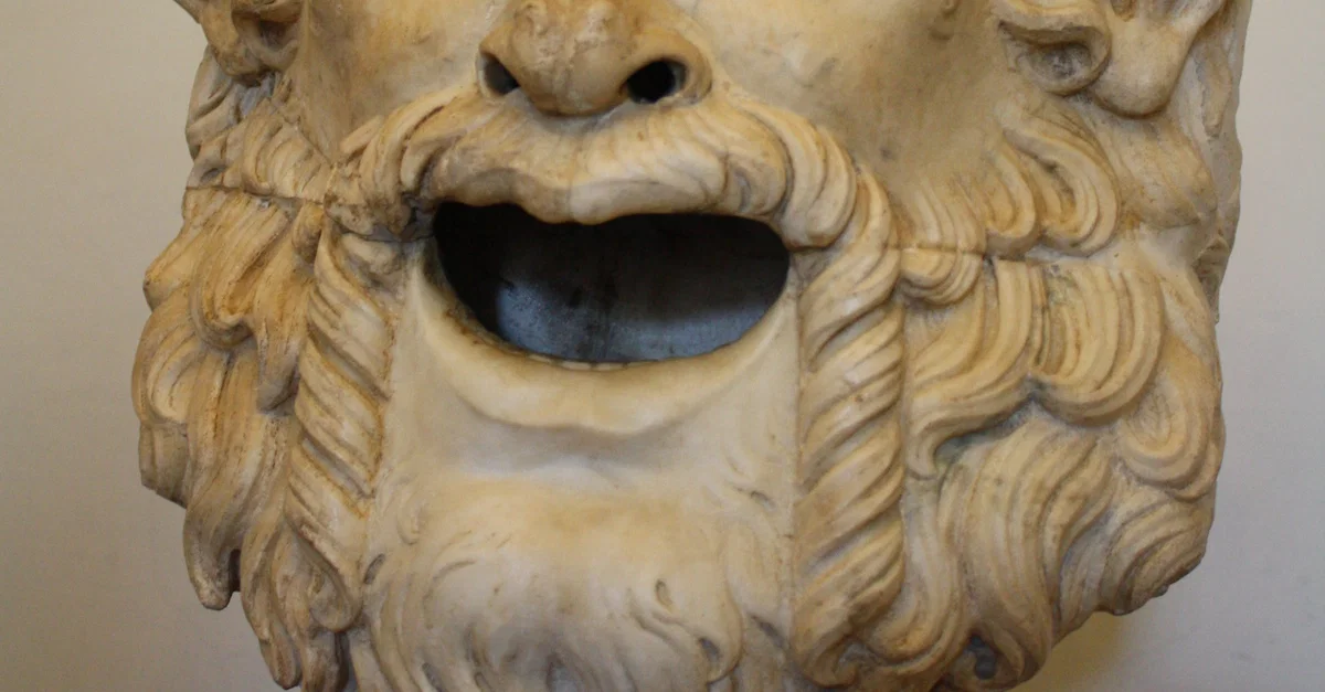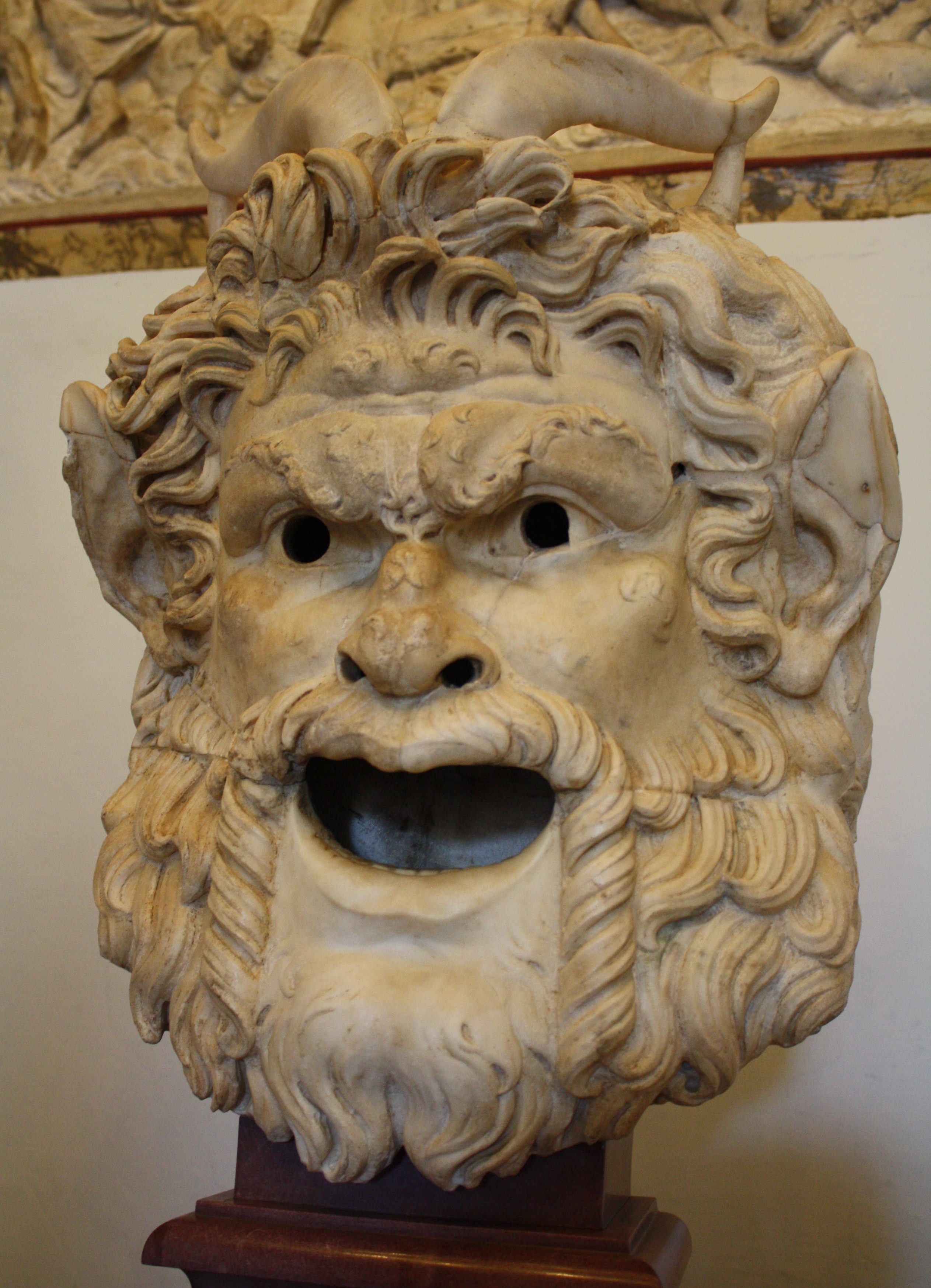 A Roman satyr mask in marble. 2nd century CE. (Capitoline Museums, Rome)