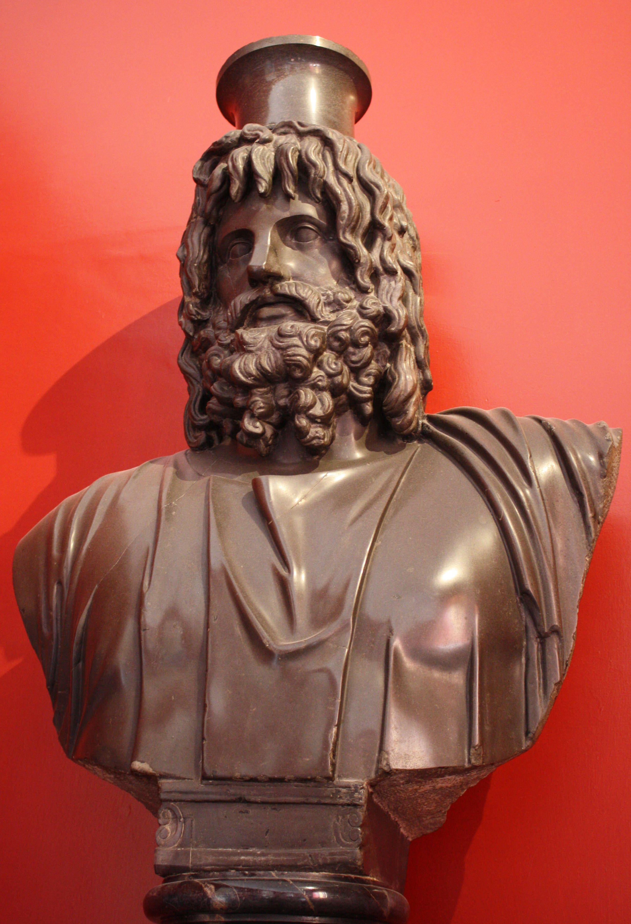 A basalt bust of Serapis, the Egyptian-Hellenistic god who was created in the reign of Ptolemy I (304-284 BCE) to create a link between the two cultures and religions of Greece and Egypt. From Rome, 2nd century CE. (Vatican Museums, Rome)