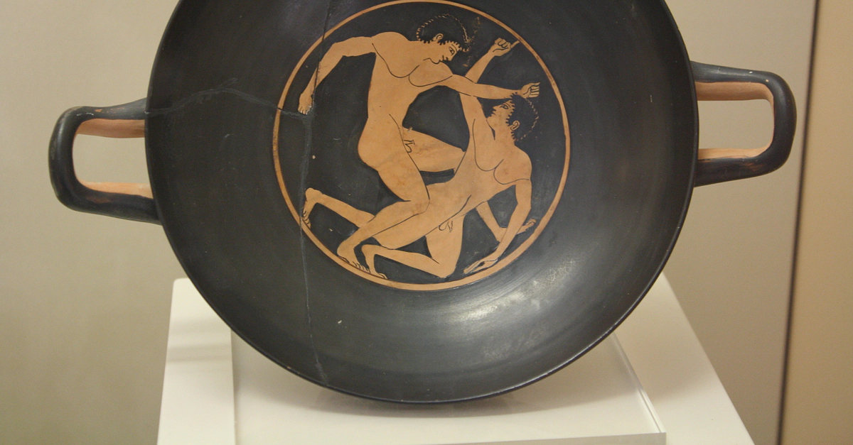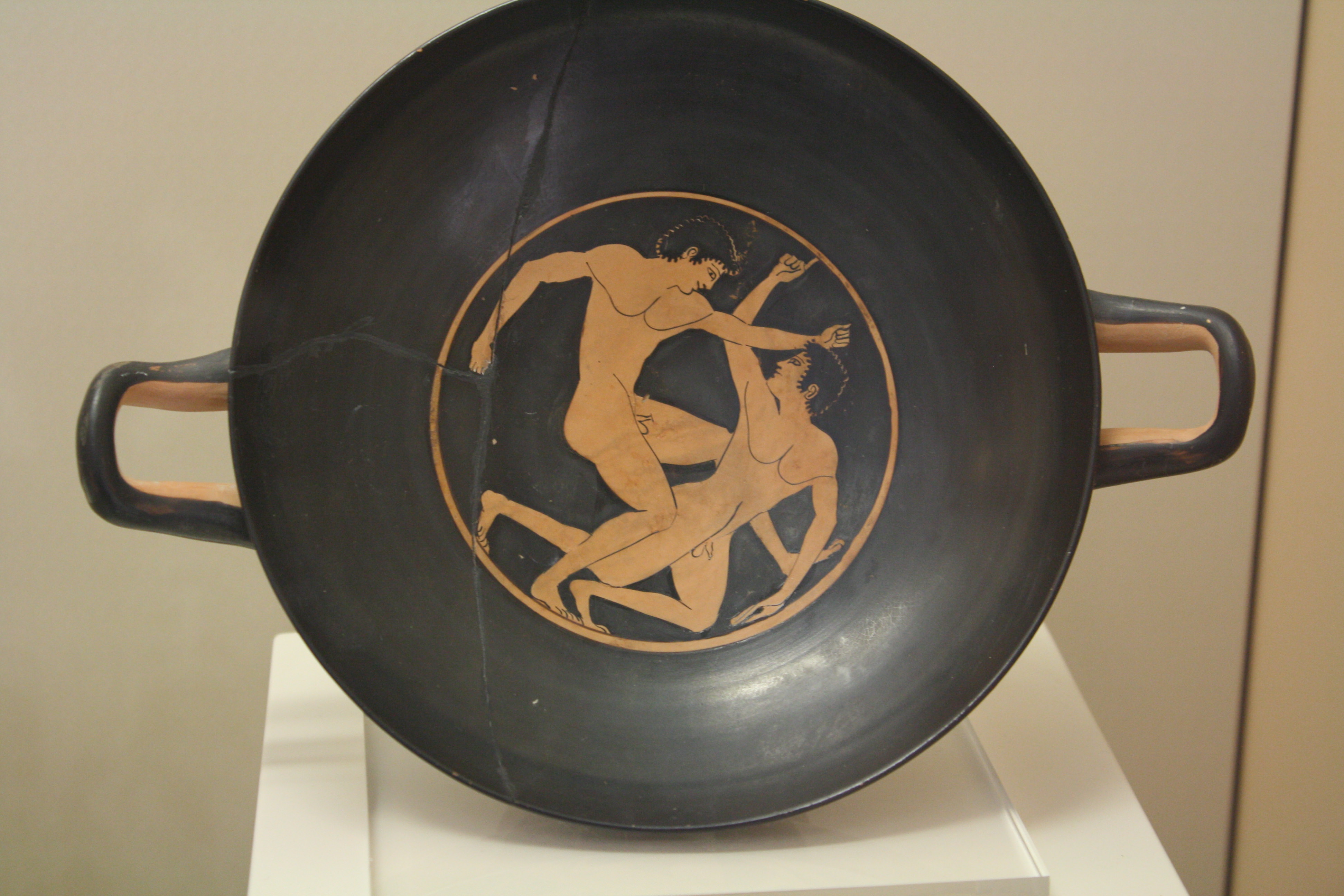 A boxing scene from an attic red-figure kylix (c. 500 BCE). Olympia Archaeological Museum.