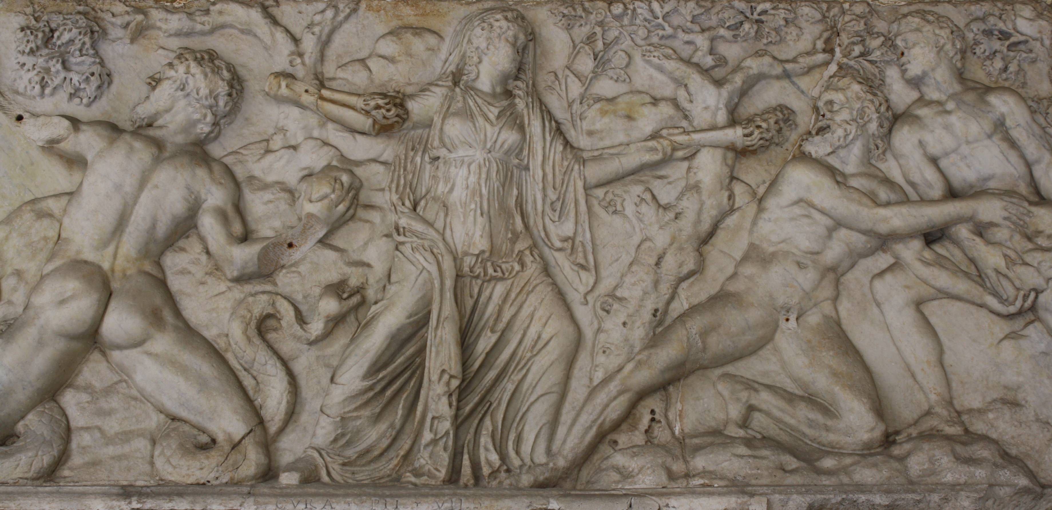 A Roman relief panel from a frieze depicting the goddess Leto fighting Giants. She holds a torch in each hand while the Giants prepare to throw large rocks. From a public building, discovered on the Oppius Hill, Rome. 2nd century CE. (Vatican Museums, Rome)