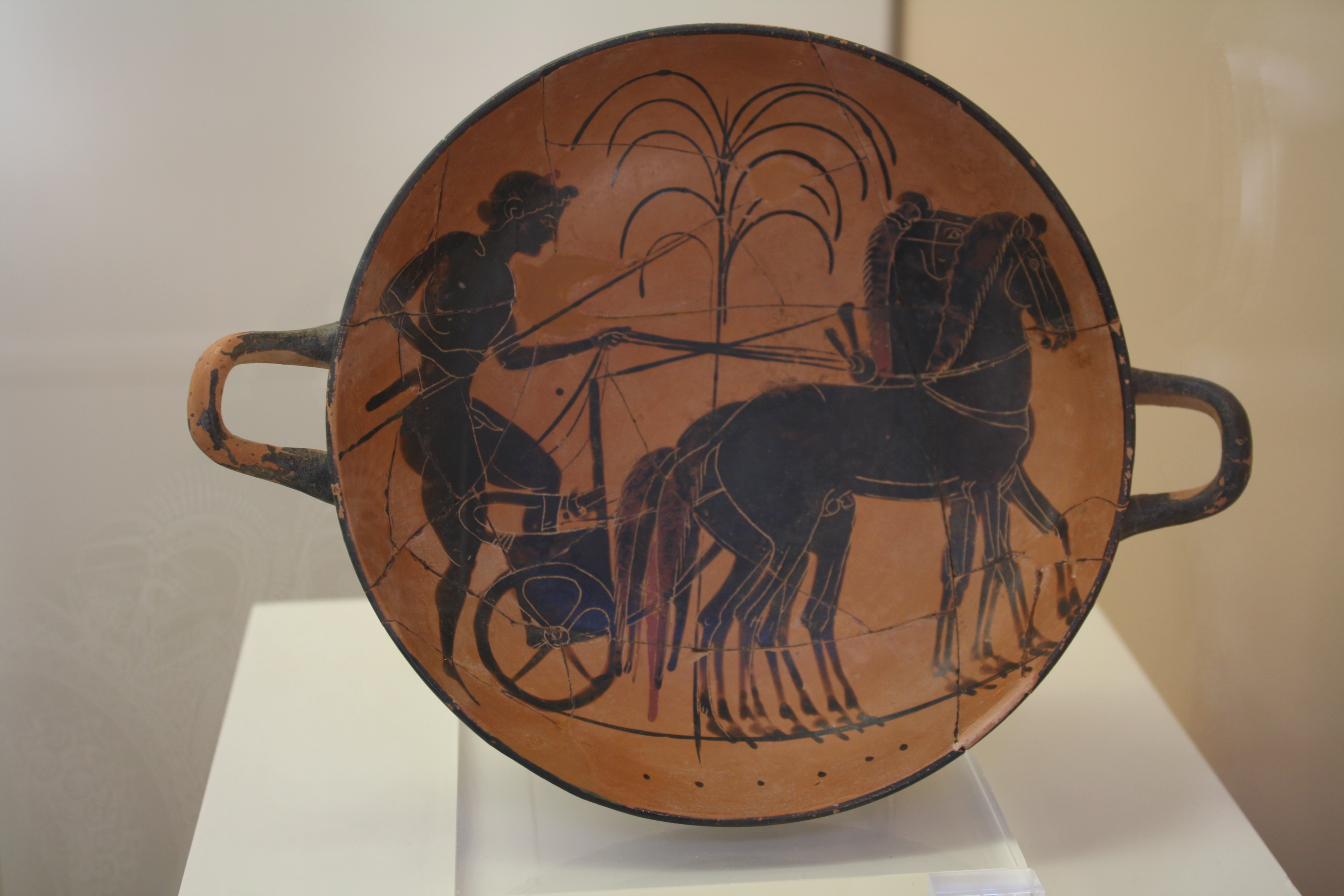 A depiction of a chariot with charioteer on an attic black-figure kylix (510-500 BCE). Olympia Archaeological Museum.