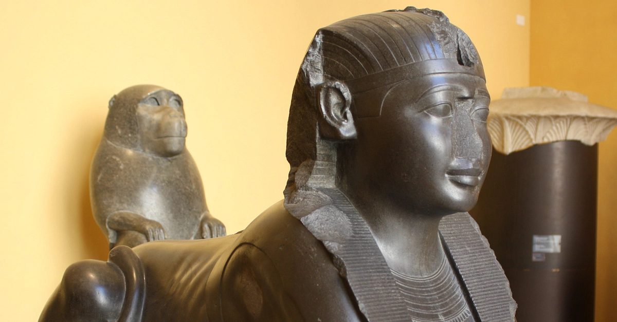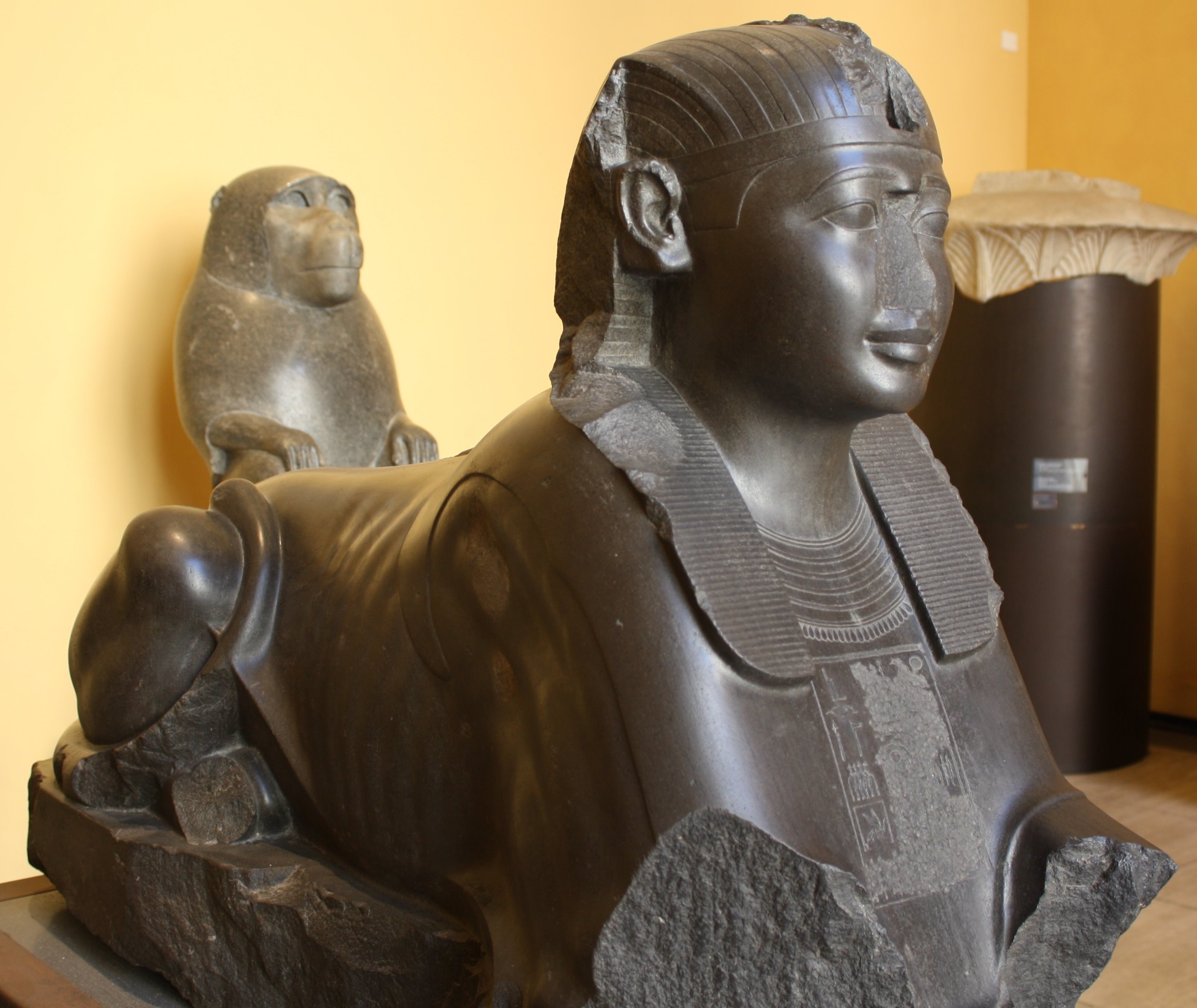 A basanite statue of a sphinx with the features of pharaoh Amasis. 26th Dynasty, 568-526 BCE. From the Temple of Isis in the Campus Martius, Rome. (Capitoline Museums, Rome)