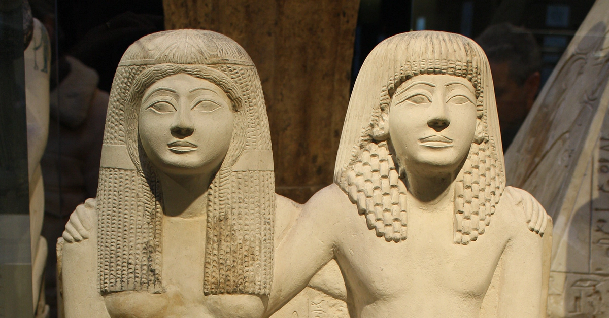 A limestone statue of Pendua and his wife Nefertari. The couple embrace in an unsual depiction. Deir-el-Medina, New Kingdom, Dynasty XIX, 1292-1186 BCE. (Egyptian Museum, Turin)