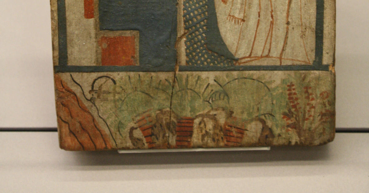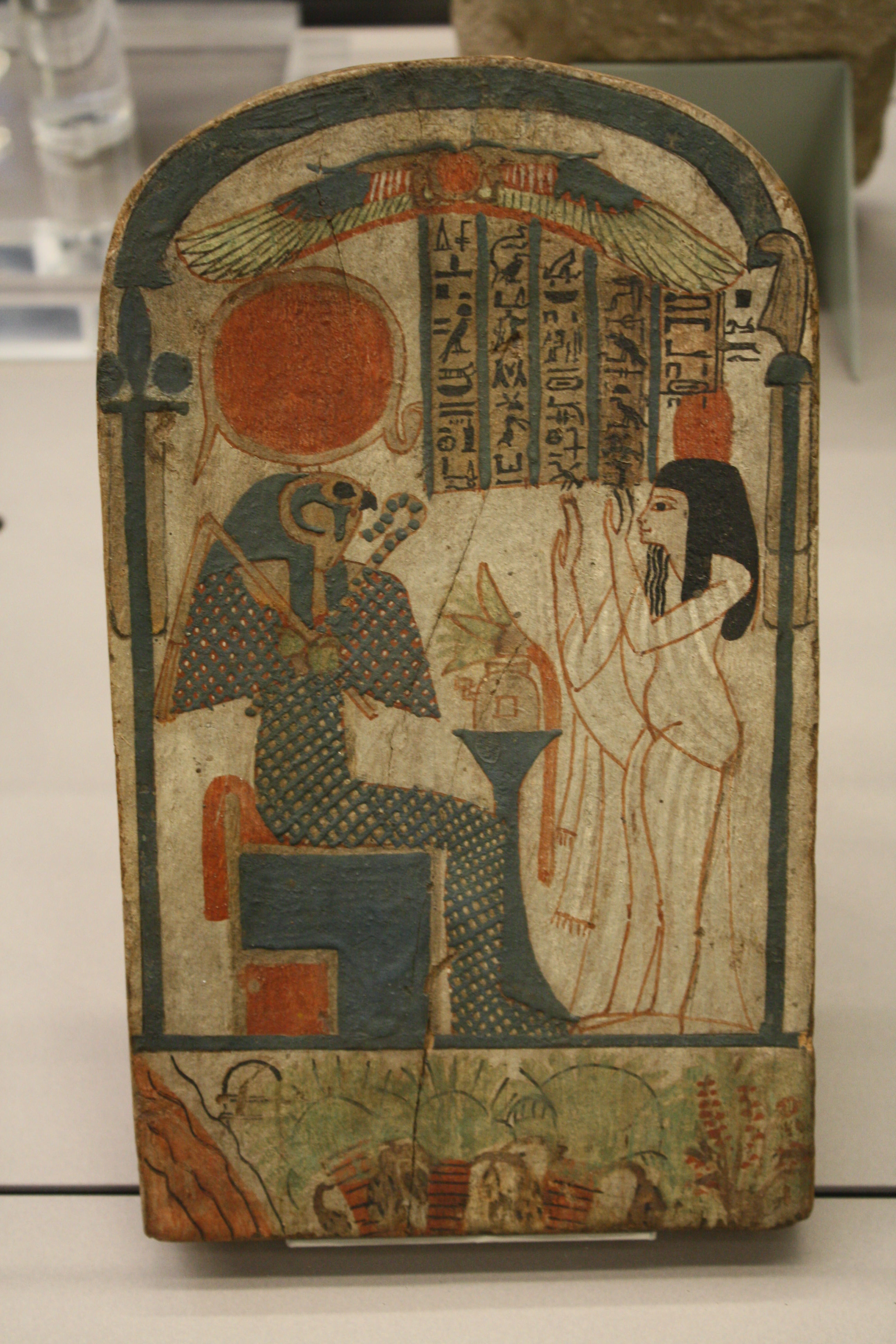 The stucco and painted wood Stele of Neskhonsupakhered. The deceased wears a transparent robe and approaches the god Harakhty on his throne. Egypt, Third Intermediate Period, Dynasty XXI-XXII, 1070-736 BCE. (Egyptian Museum, Turin)