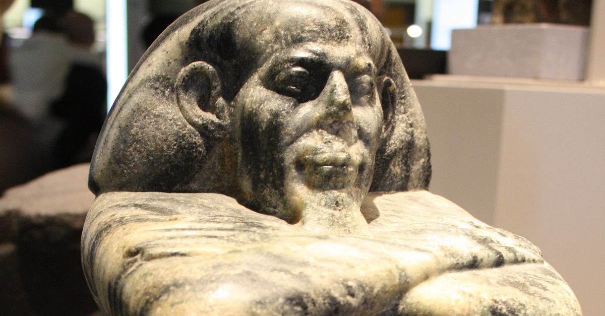A diorite sculpture of pharoah Merenptah as the Divine Father and Priest of Bastet. Memphis, Dynasty XXV, 720-700 BCE. (Egytpian Museum, Turin)