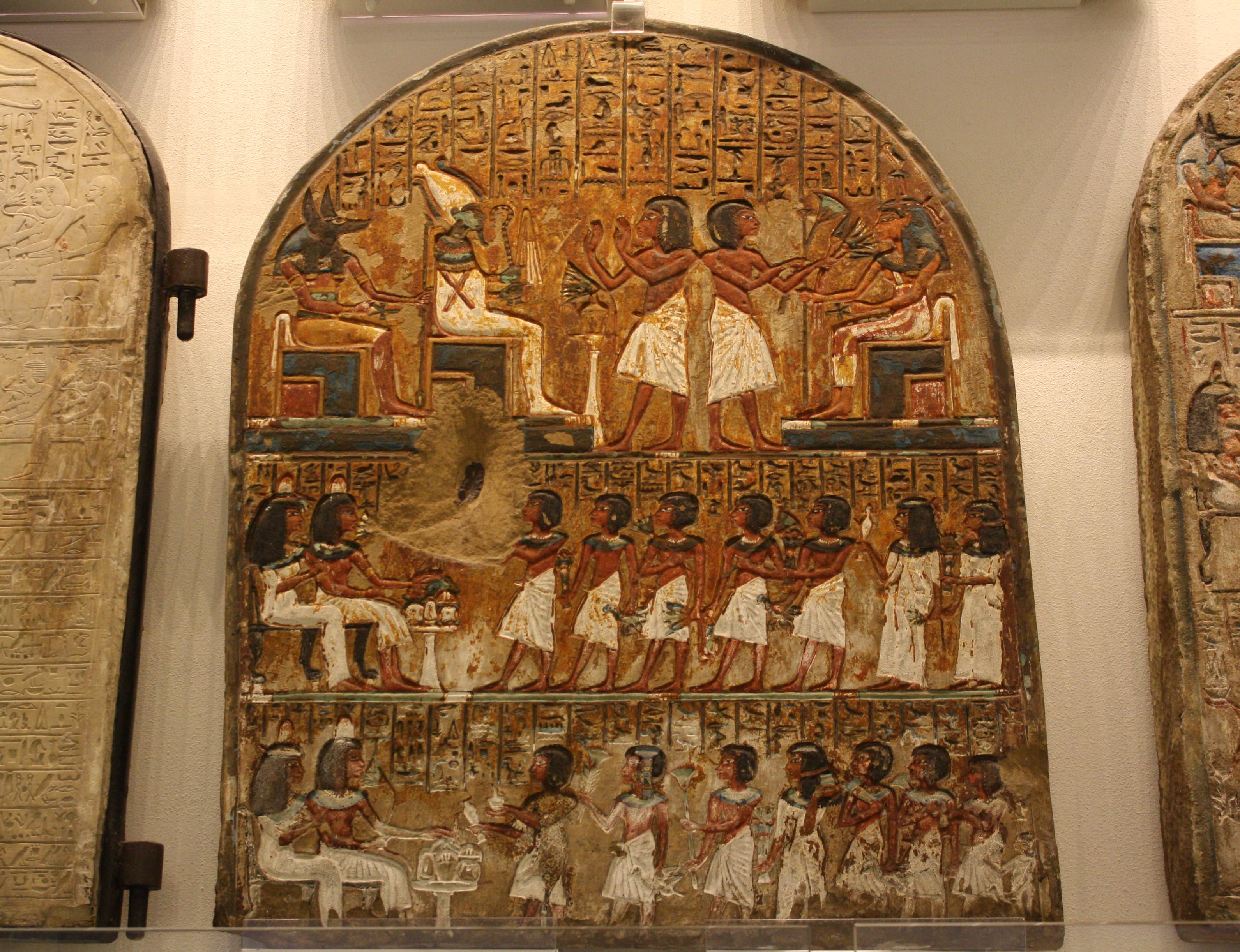 A sandstone relief stele depicting in the top panel Minhotep and his son Nakhtmin making offerings to Hathor, Anubis, and Osiris. The middle panel shows Minhotep and his wife Nefertari. The bottom panel shows Nakhtmin and his wife Sekhmet. New Kingdom, Dynasty XVIII, c. 1300 BCE. (Egyptian Museum, Turin)