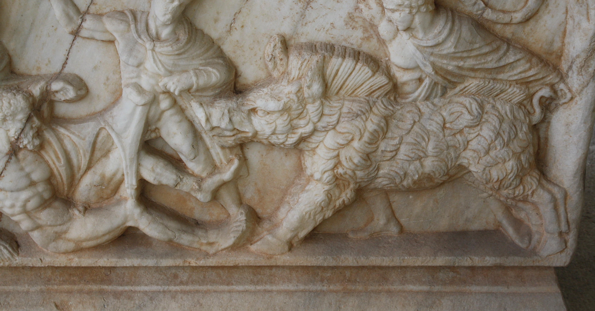 A scene from a Roman sarcophagus depicting the Greek hero Meleager fighting the Calydonian boar. From Nea Ionia (Treis Gefyres). 2nd century CE. (Archaeological Museum, Piraeus, Athens)