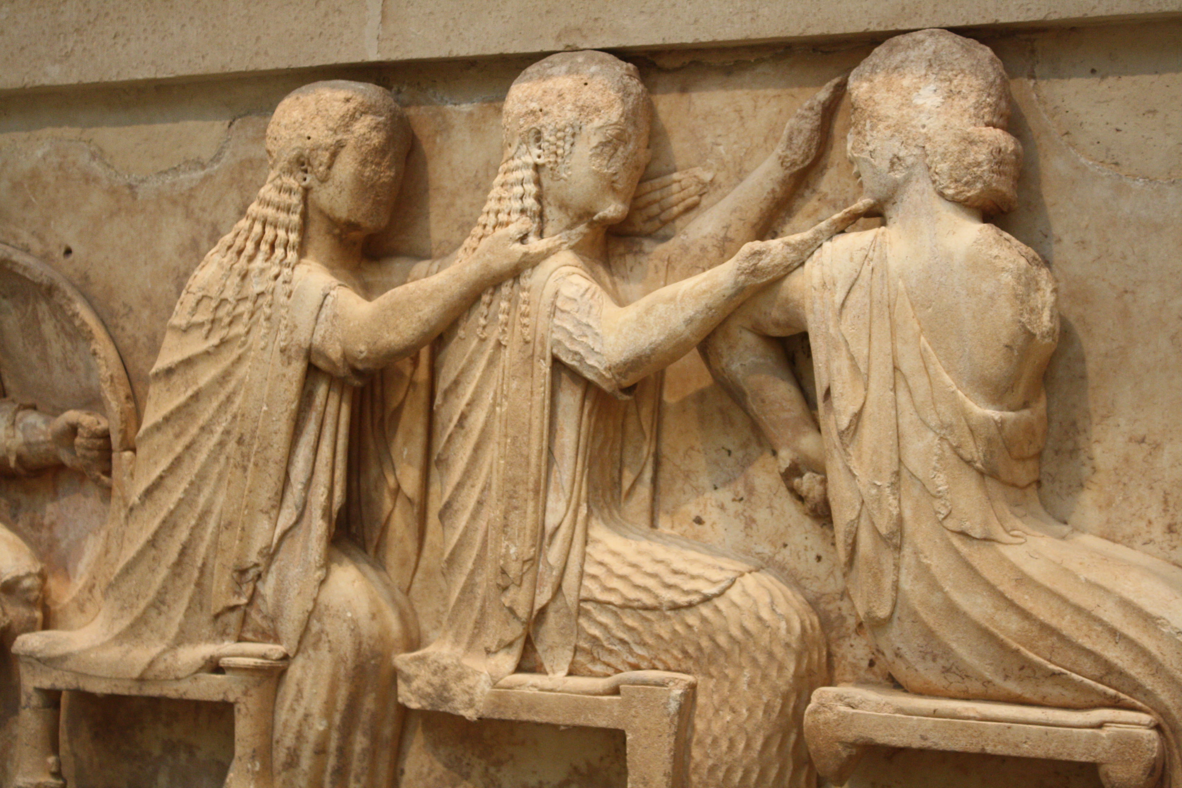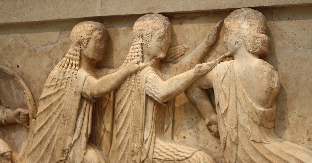 A detail of the assembly of the gods from the east frieze of the Treasury of the Siphians (525 BCE), Delphi. Delphi Archaeological Museum.