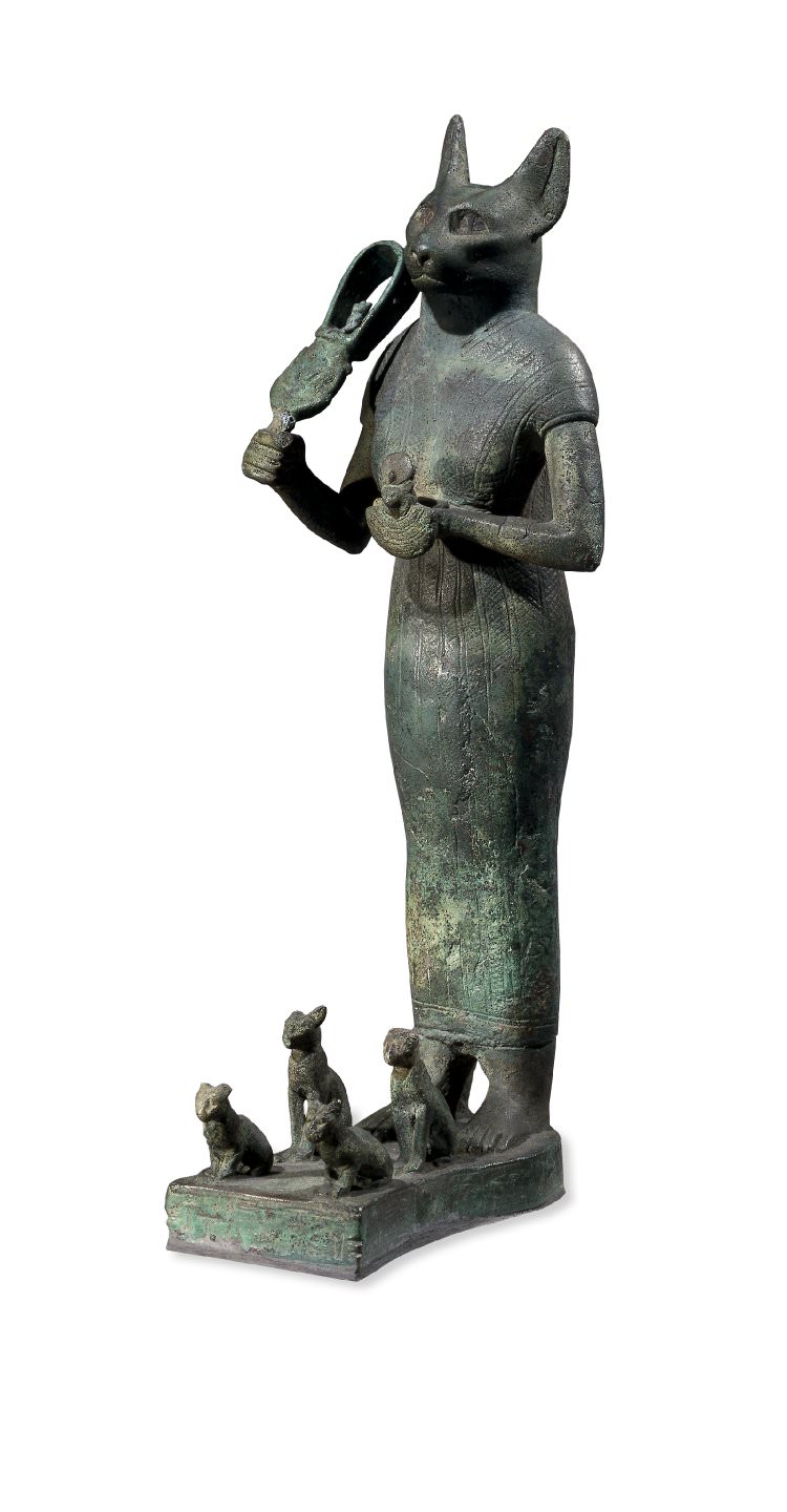 Bronze figure of Bastet from the Late Period of Ancient Egypt. Bastet, represented as a cat or a woman with a cat's head, was adored as goddess of fertility, festivity and intoxication.