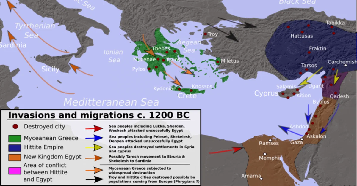 A map of the Late Bronze Age Mediterranean indicating the various invasions and migrations of the period.