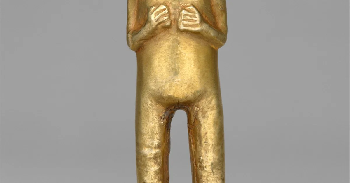 A gold female figurine from the Inca civilization, 15-16th century CE, Peru. Height 15 cm. Such precious figures were typically buried with important people. (The Metropolitan Museum of Art, New York)