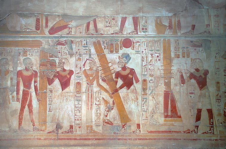 A scene from the Hall of Osiris at Abydos which shows the raising of djed pillars, symbols of stability.