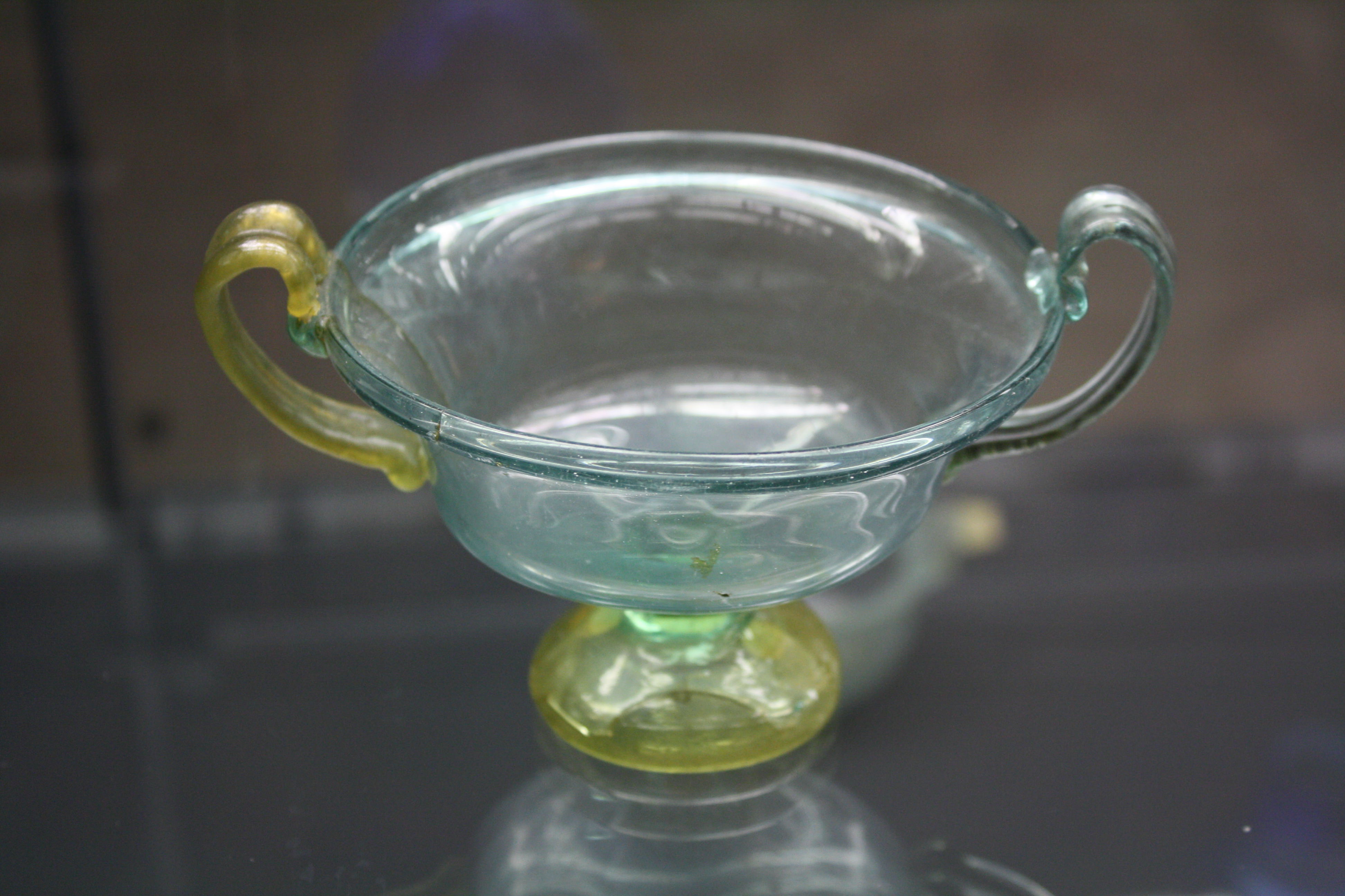 Roman glass two-handled cup. 1st-2nd century CE. Provenance unknown. (Archaeological Museum of Pavia, Italy).