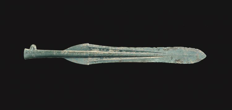 Ritual bronze spear-blade (dohoko) from the Yayoi Period. The blade is said to have been excavated at Okamoto-cho, Kasuga City, modern Fukuoka Prefecture, Japan.