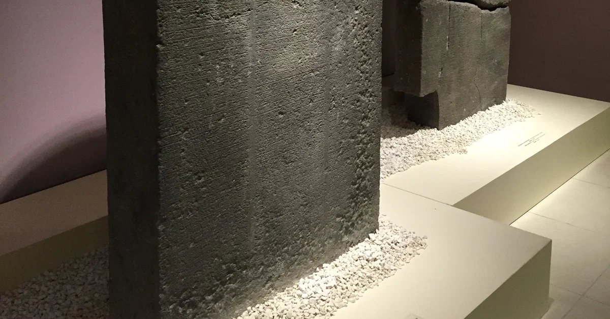 These large tablets comes from the 6th-5th century BCE. They contain the inscriptions from King Nabonidus, who was the last king of the Neo-Babylonian Empire, reigning from 556–539 BC. These tablets were found in Harran - near Sanliurfa, Turkey - which was an Assyrian stronghold and also contained the temple of the moon-goddess, of whom Nabonidus' mother was a priestess. It is housed at the Sanliurfa Archeological Museum in Sanliurfa, Turkey.