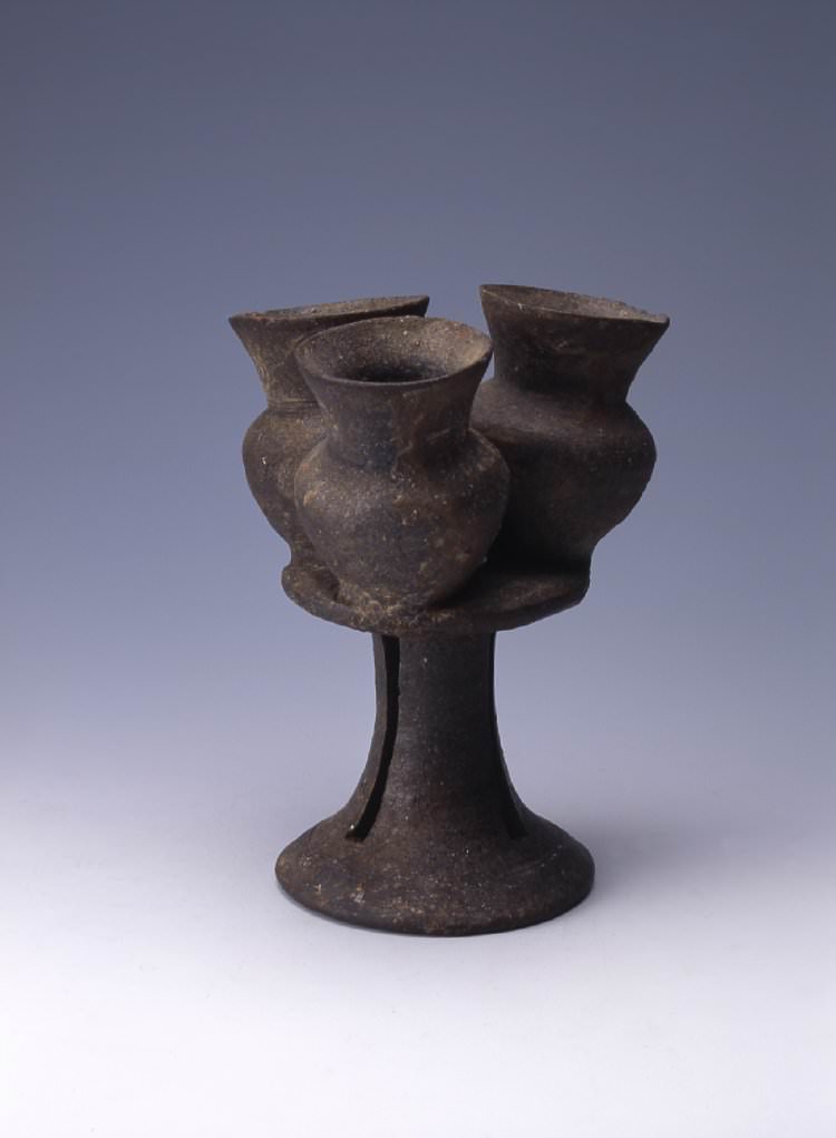 Three jars on pedestal platform, made of high-fired stoneware with natural ash glaze, from early 6th century Kofun Period Japan.