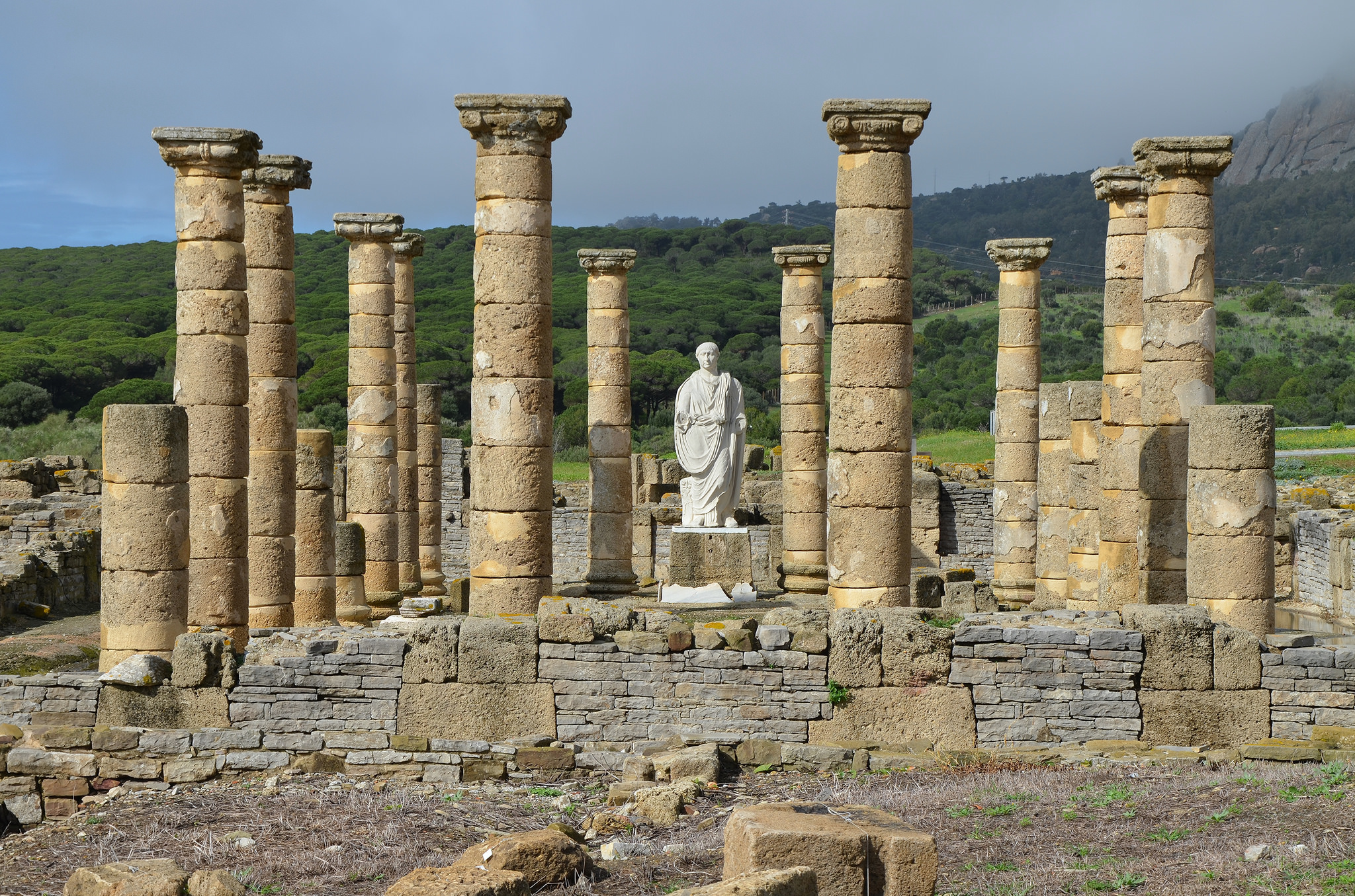 The Basilica at Baelo Claudia in Southern Spain, built around 50-60 CE to the South of the Forum of the city. It was a two-storey building built of ashlar and concrete walls covered in stucco. The city erected a colossal statue of Trajan.
