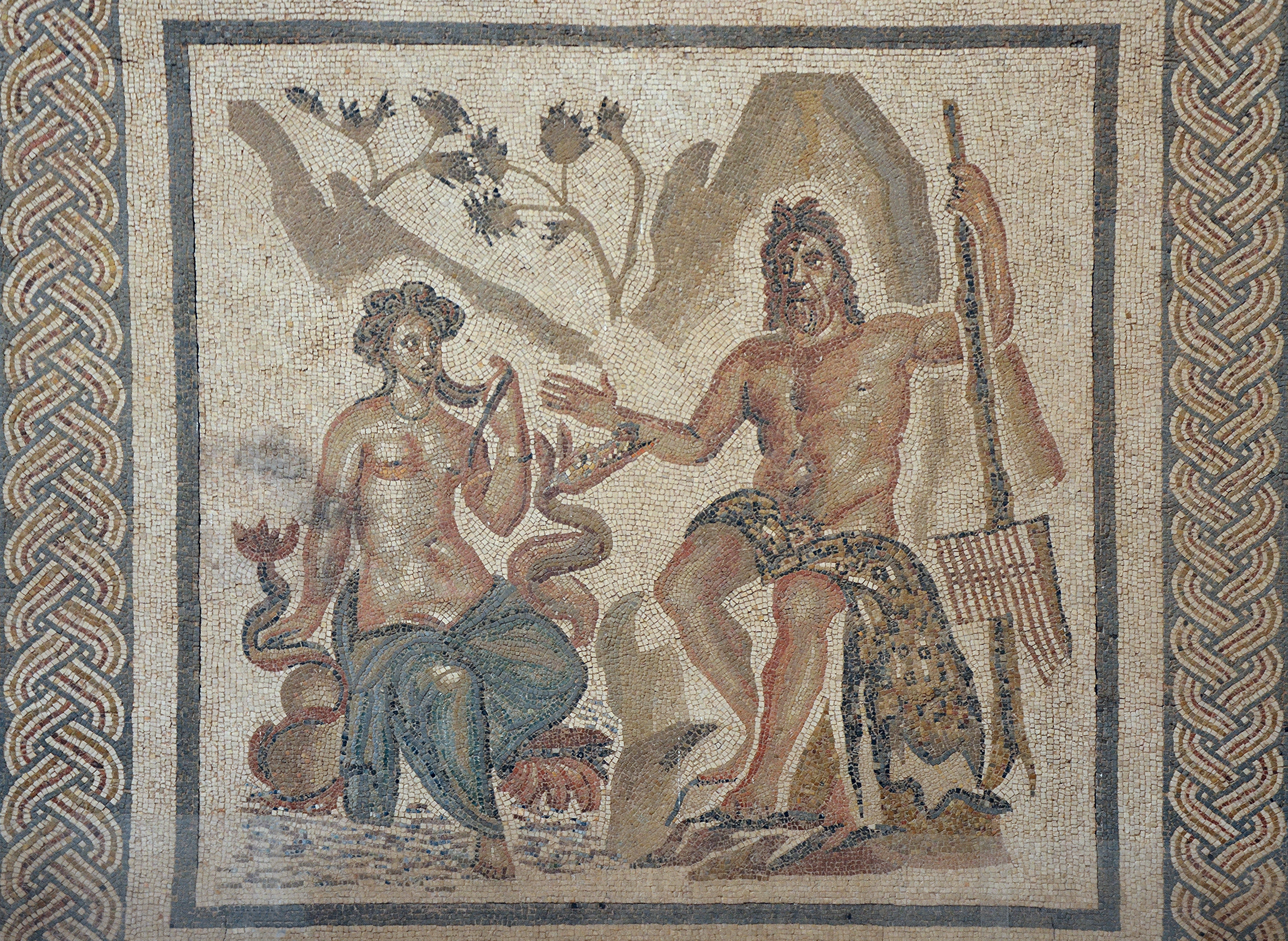 Mosaic with the Cyclops Polyphemus and the nymph of the sea Galatea, discovered in 1959 during excavation work under the Plaza de la Corredera in Cordoba, Spain. The mosaic dates to the 2nd century CE.